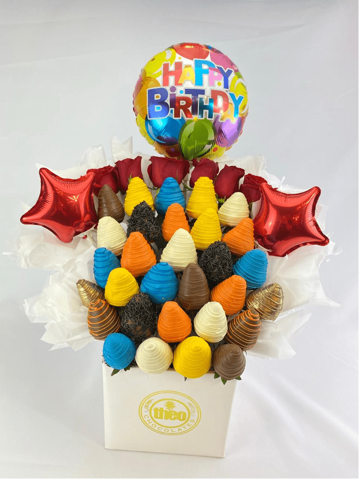 Caja cuadrada con 6 rosas naturales, 30 fresas cubiertas y decoradas con chocolate de colores y 3 globos de 4”