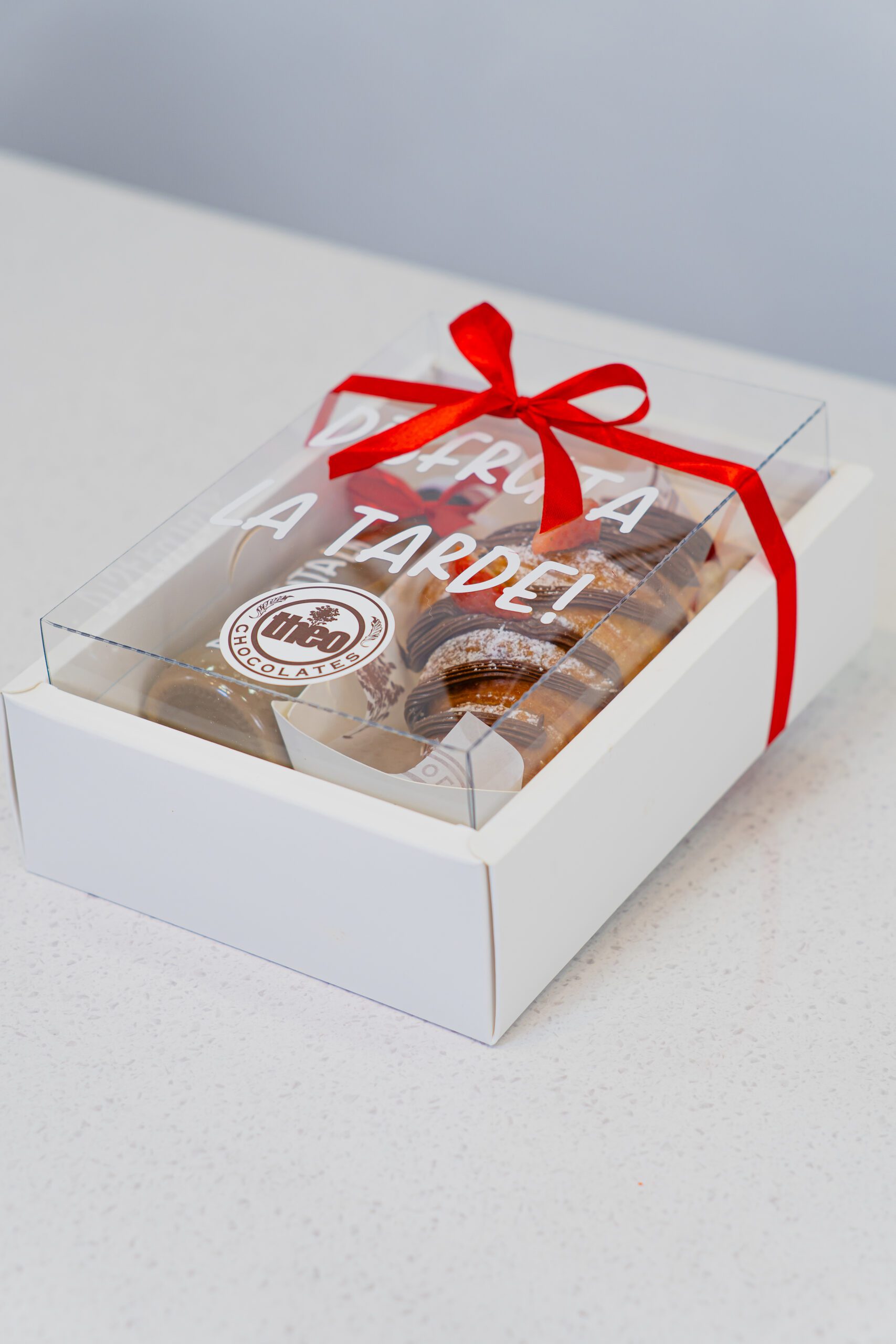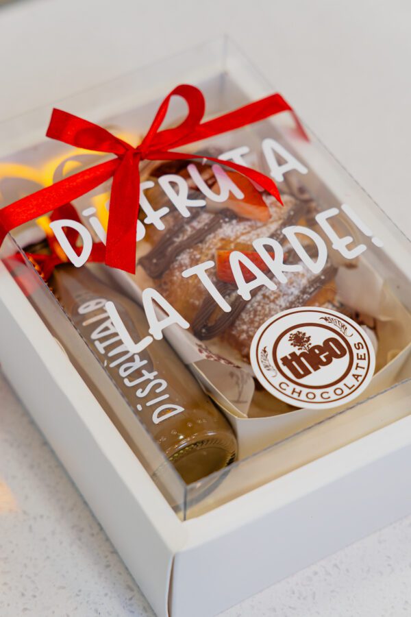 - Caja de cartón blanca rígida con tapa transparente personalizada decorada con lazo y colilla.