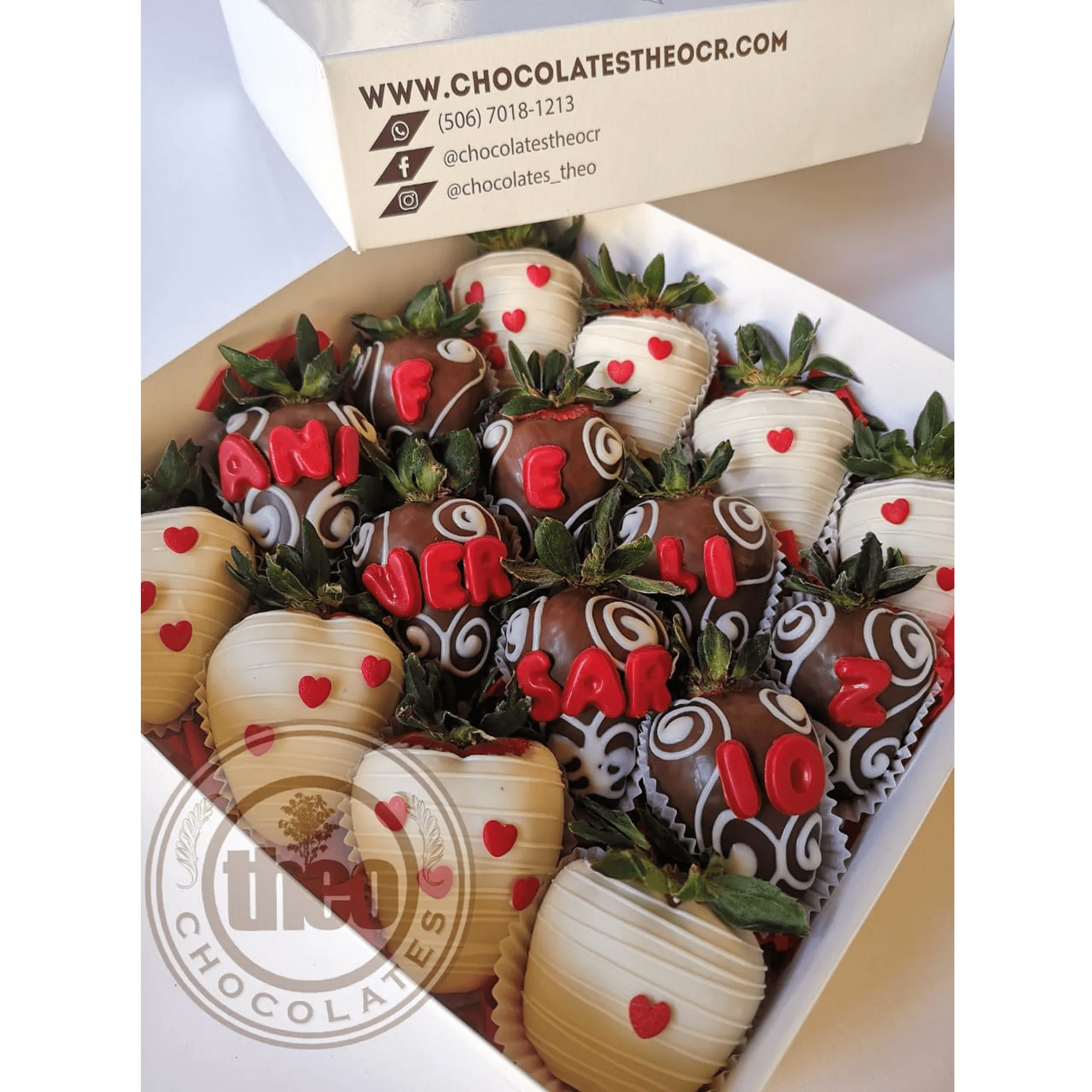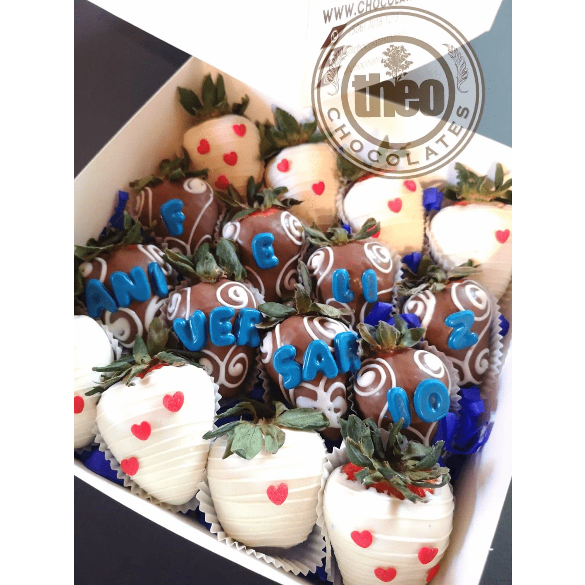 Caja con 16 fresas cubiertas y decoradas con chocolate y mensaje de “Feliz Aniversario” en letras de chocolate.