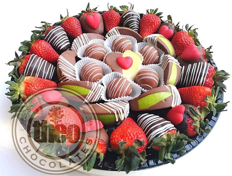 Contiene Fresas, uvas, gajos de manzana y bombones de chocolate de sabores surtidos.