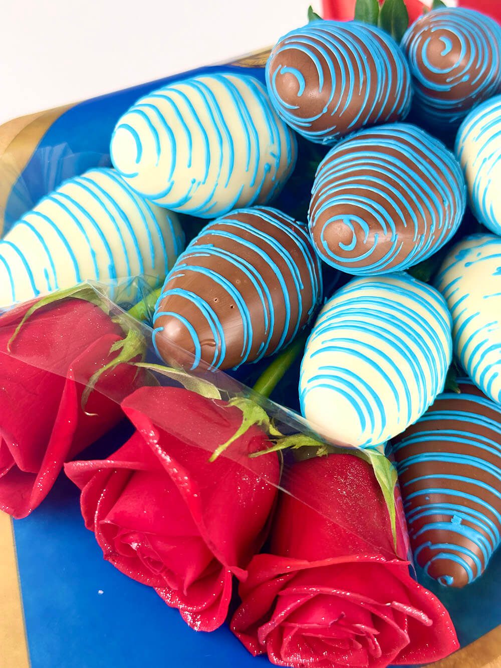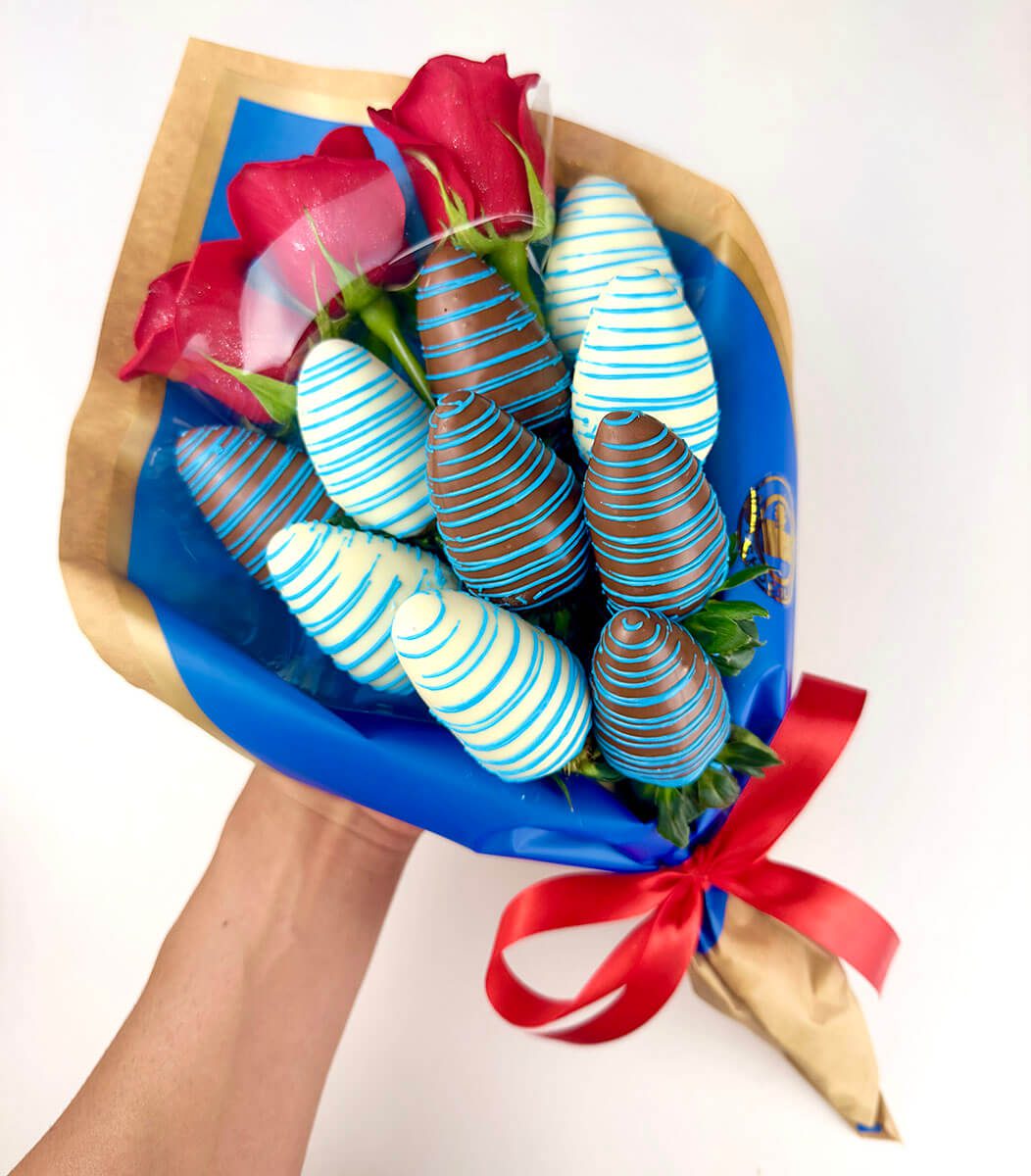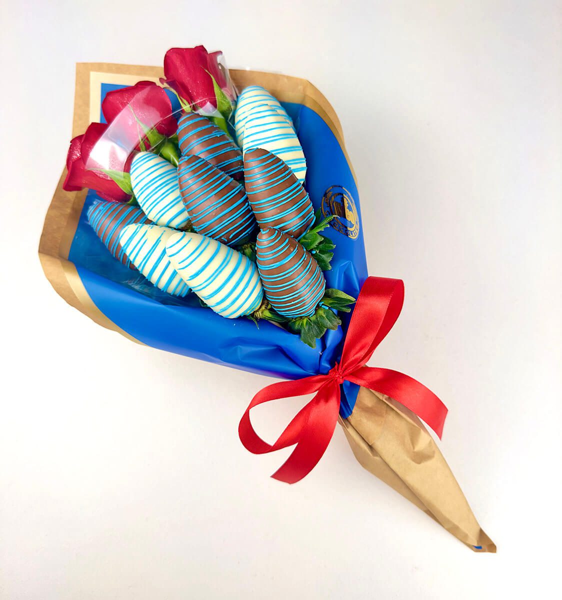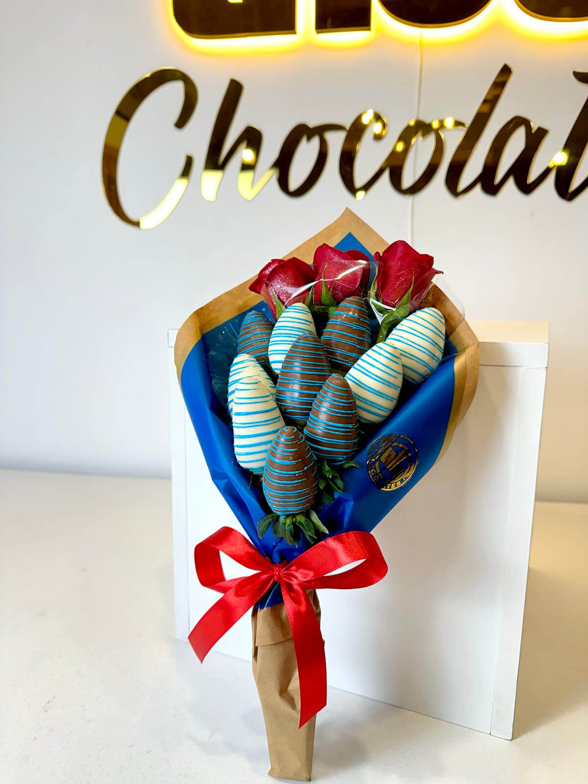 Ramo con 10 fresas cubiertas y decoradas con chocolate y 3 rosas naturales