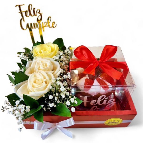 Caja roja (consultar disponibilidad), con 3 rosas blancas y follaje, un queque de tamaño personal en caja de acetato con lazo y Topper de cumpleaños, se puede cambiar por “Te amo” o “feliz día”.