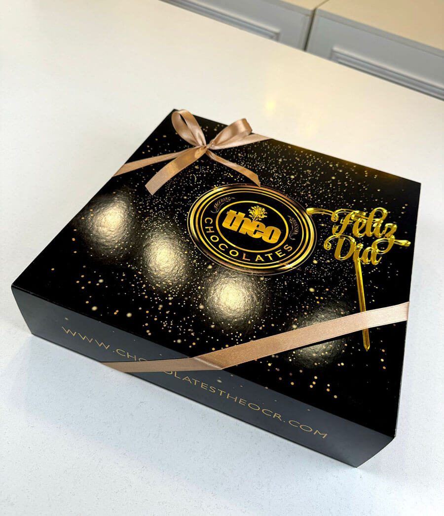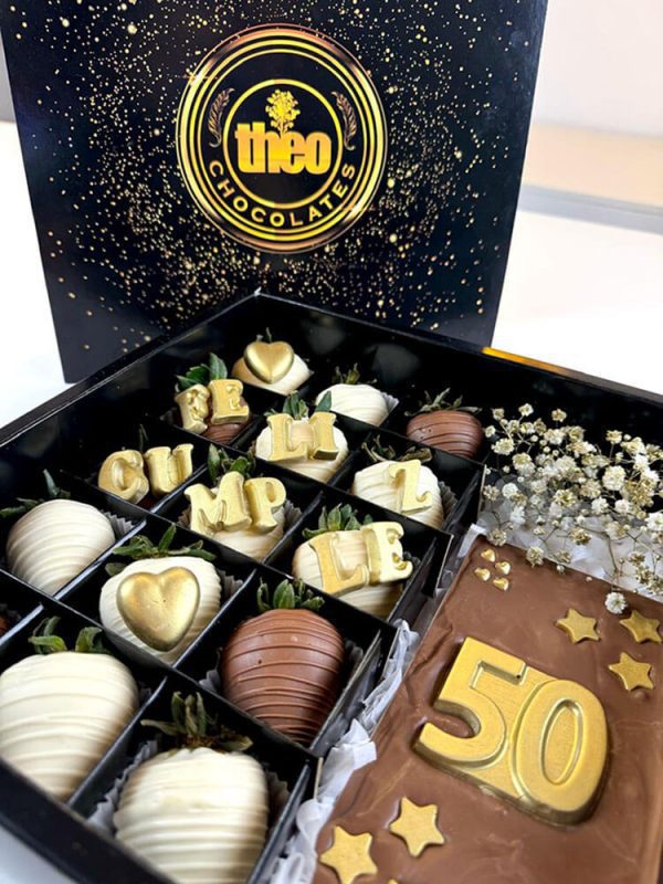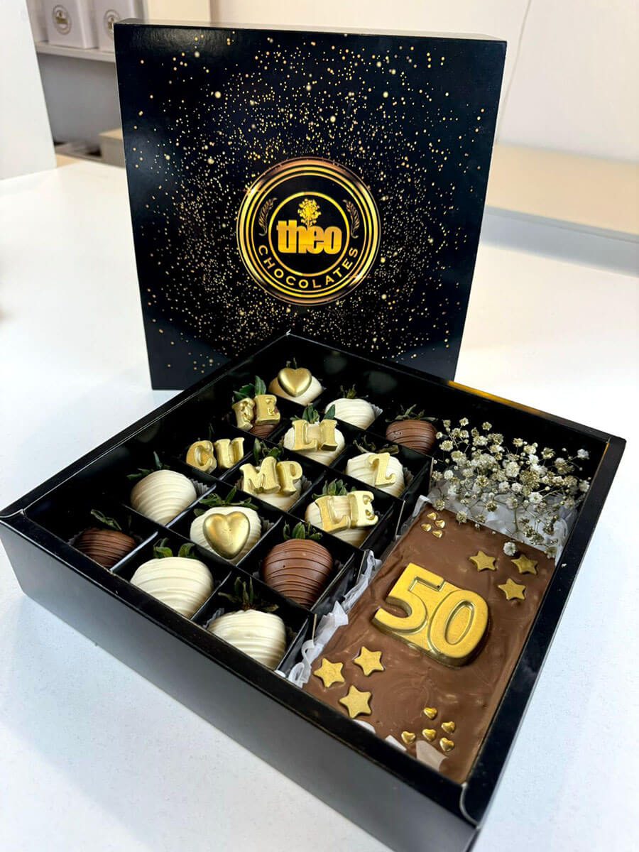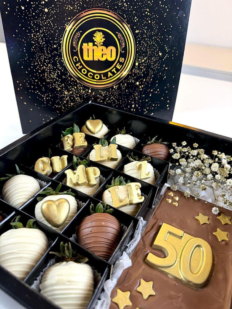 Caja con 15 fresas cubiertas de chocolate, con apliques de letras en chocolate blanco pintadas de dorado.