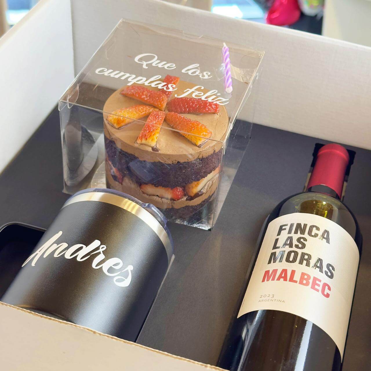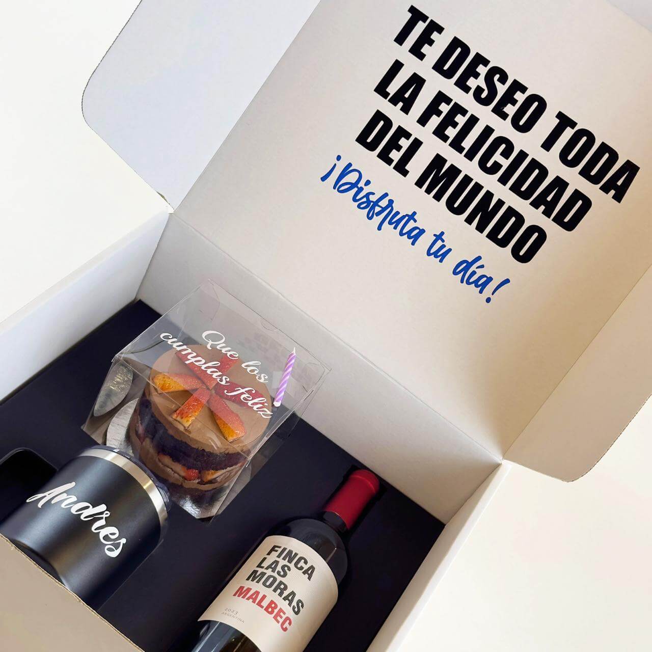 Caja con inserto personalizado con una botella de vino, una jarra de metal personalizable y un queque de tamaño personal al cual le puedes personalizar su caja y elegir entre el sabor de chocolate y vainilla.