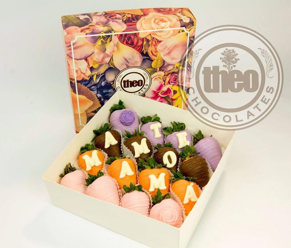 Caja con 16 fresas cubiertas y decoradas con chocolate en colores pastel, 2 botones de rosa en chocolate y la frase “Te Amo Mamá” en letras de chocolate blanco