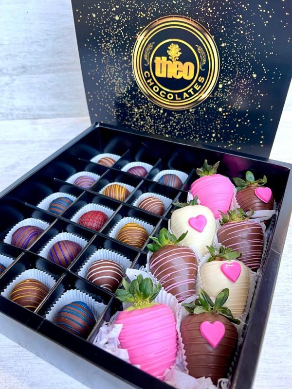 Caja con 15 bombones de chocolate de diferentes sabores, acompañados de 8 deliciosas fresas con chocolate, algunas de ellas con corazoncitos.