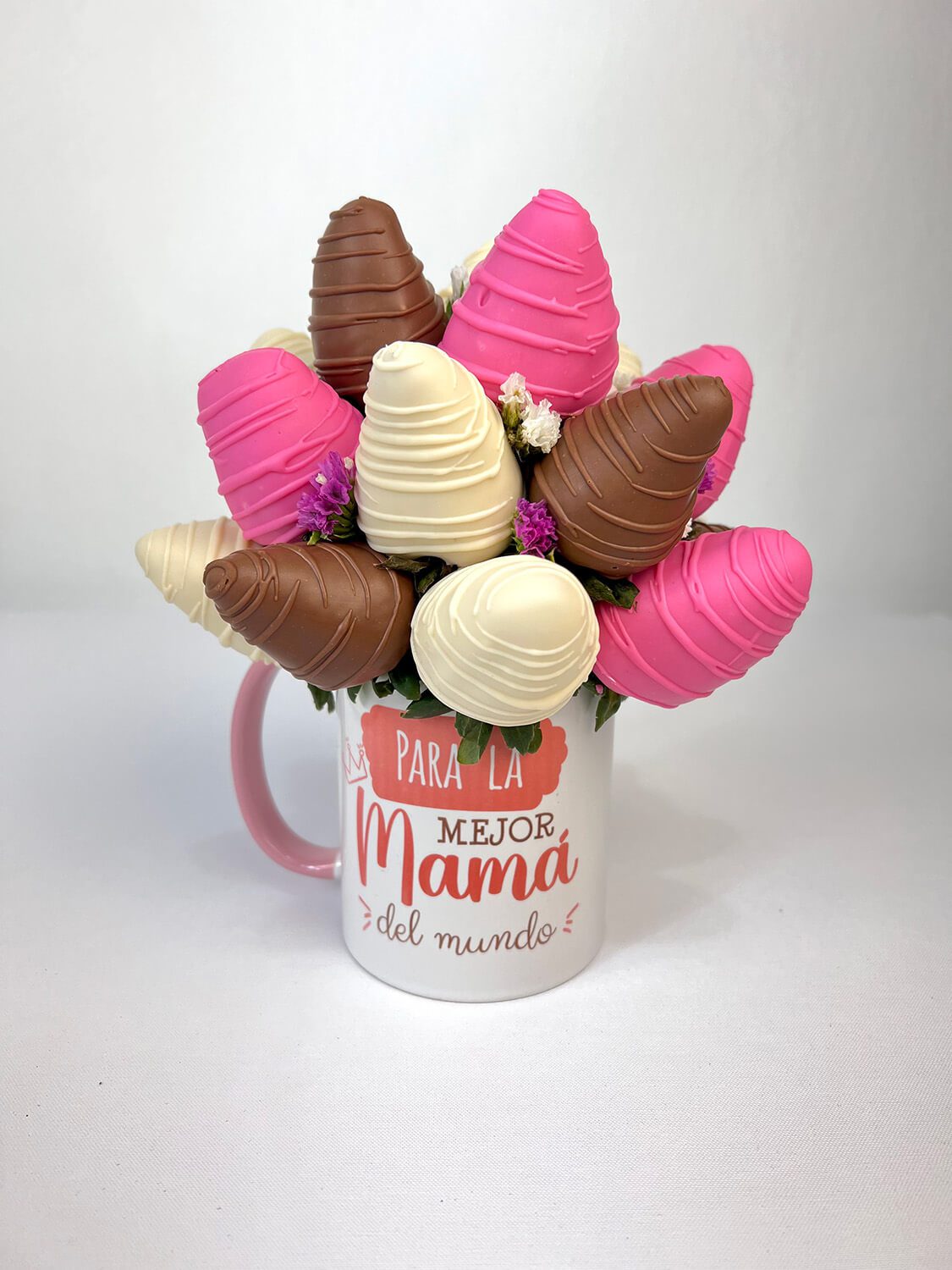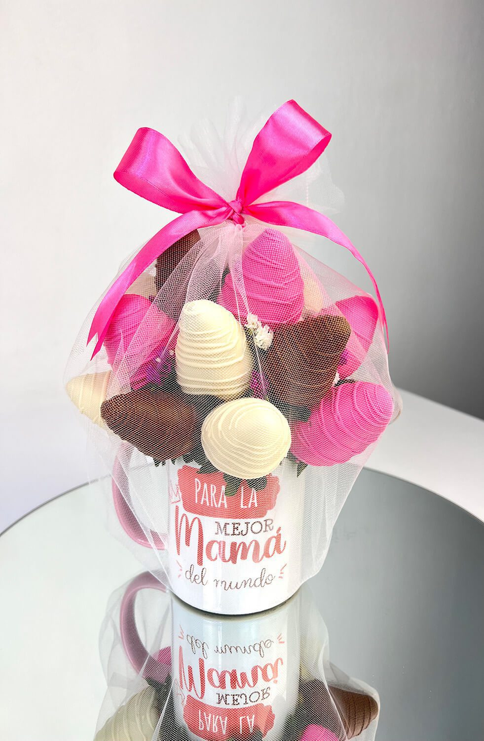 Arreglo con 18 fresas con chocolate en colores blanco, negro y rosado; con taza con mensaje “Para la mejor Mamá del mundo”. Empacado en tela tipo “tull” de color blanco