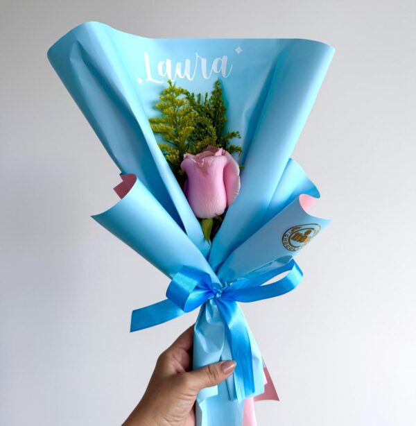 Ramo con 1 rosa natural de color amarillo, rosado o roja, envuelta en papeles de colores y con el nombre personalizado.