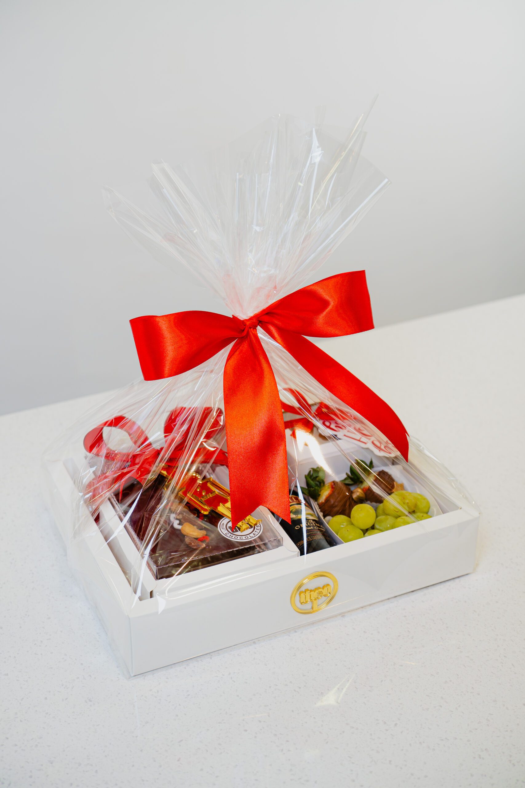 • Caja de cartón transparente envuelta en celofán con lazo decorativo