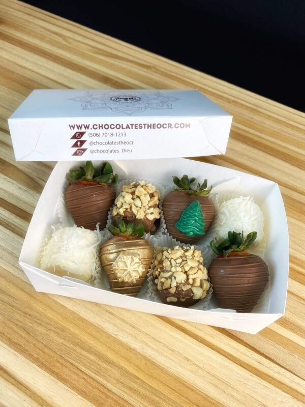 Deliciosa caja con 4 fresas y 4 marshmallows cubiertos con chocolate.