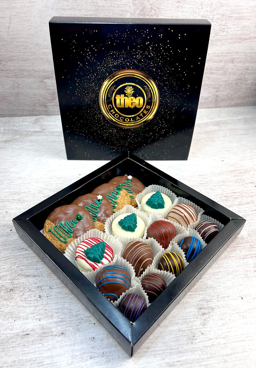 Caja con 5 bombones de chocolate, 5 chocolates rellenos, y 7 galletas navideñas con decoraciones de arboles de navidad
