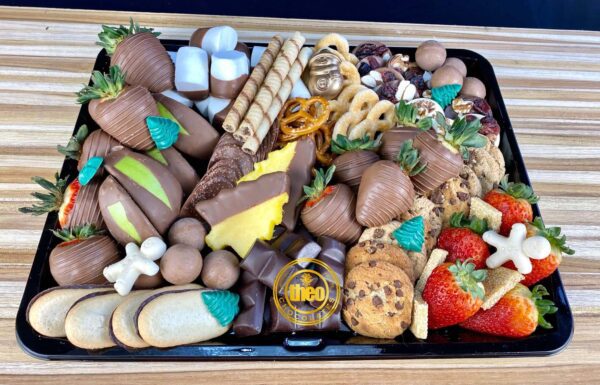 Plato surtido con fresas, manzanas, piñas, galletas de diferentes tipos, marshmallows, chocolates de diferentes tipos; Ideal para 6 personas aproximadamente.