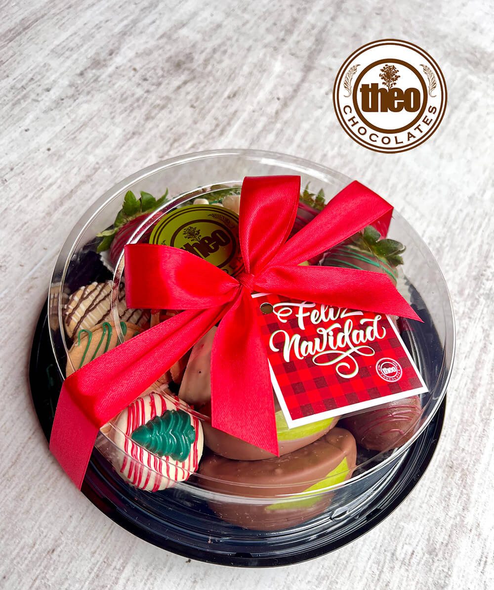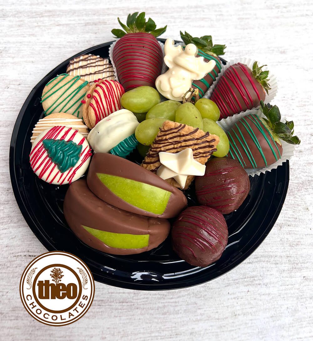 El plato contiene 2 gajos de manzana cubiertos con chocolate, uvas, 4 fresas cubiertas con chocolate , 2 bombones de chocolate y un surtido de galletas con chocolate