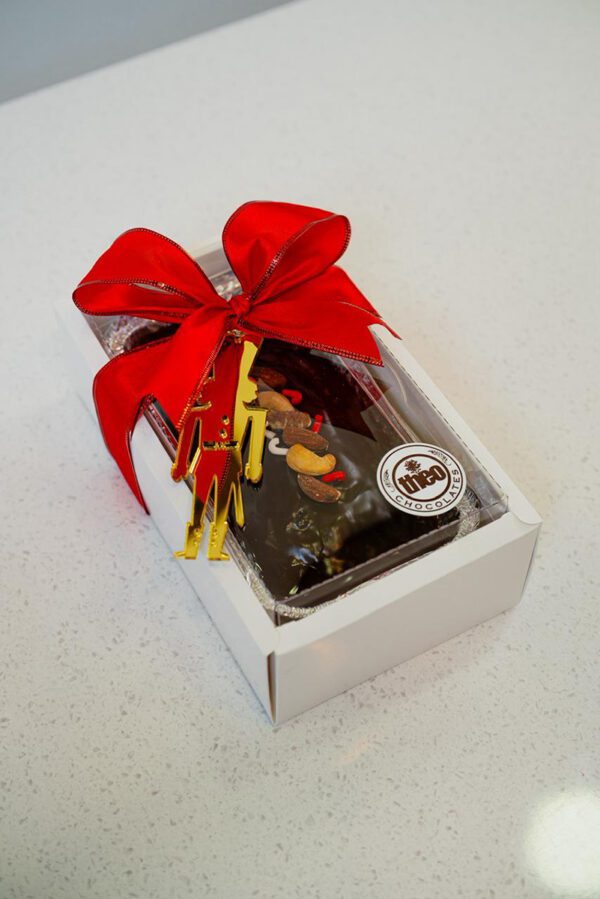 Empacado en una caja blanca de cartón rígido hecha a la medida, con tapa de acetato transparente, decorado con un topper dorado de cascanueces y un lazo de tela.