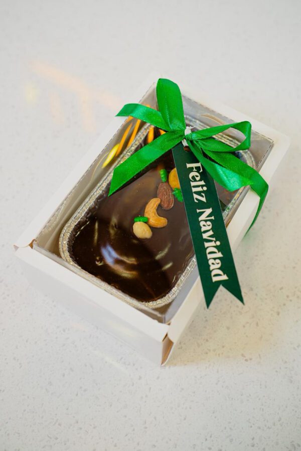 Delicioso y elegante postre navideño, un queque navideño ligeramente mojado con ron, cubierto con crema de chocolate y semillas; perfecto para disfrutar en una tarde cálida.