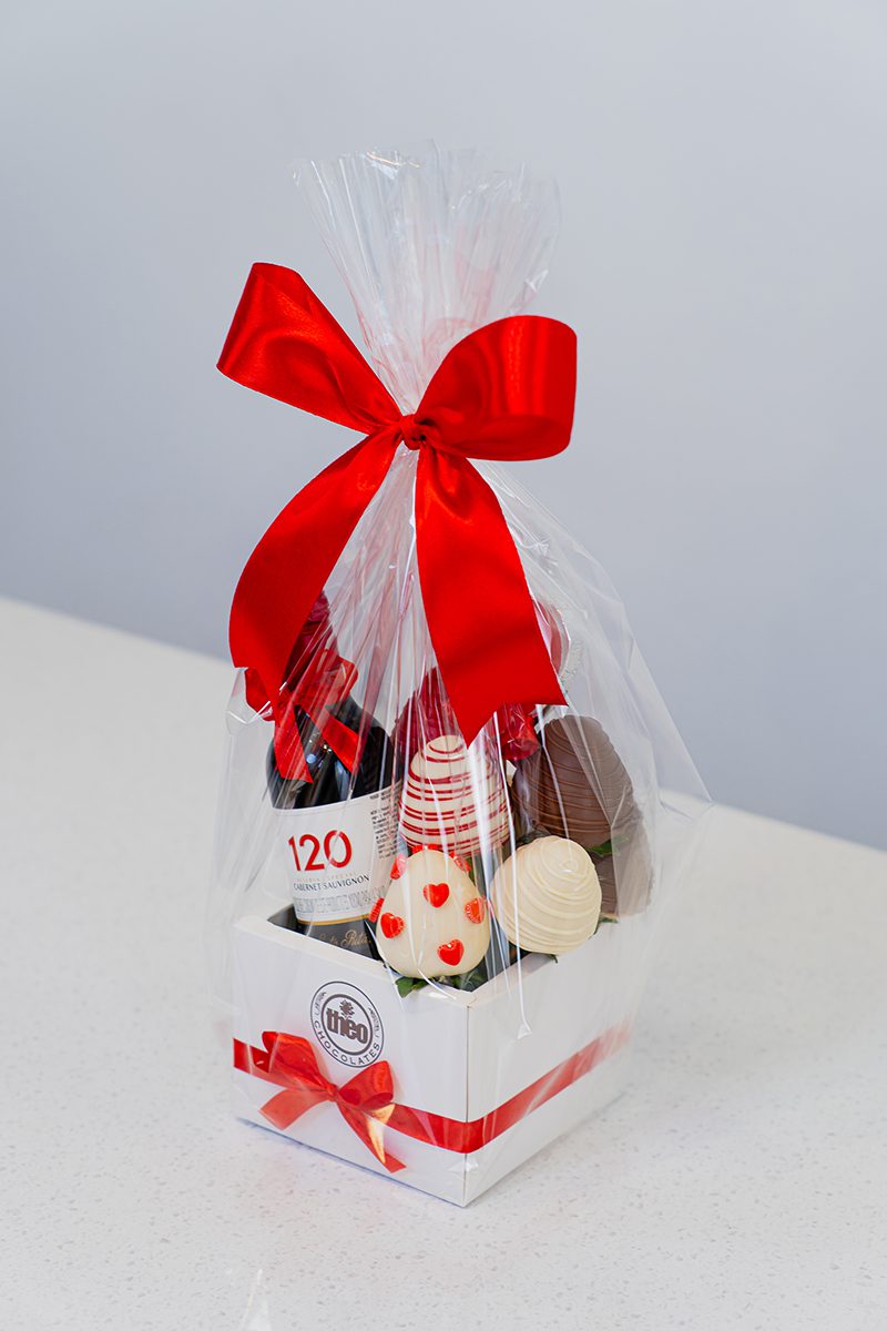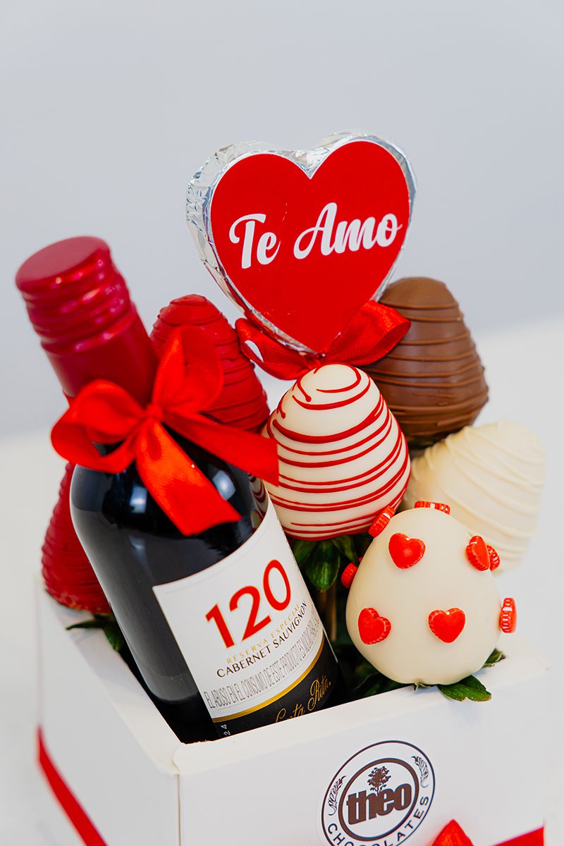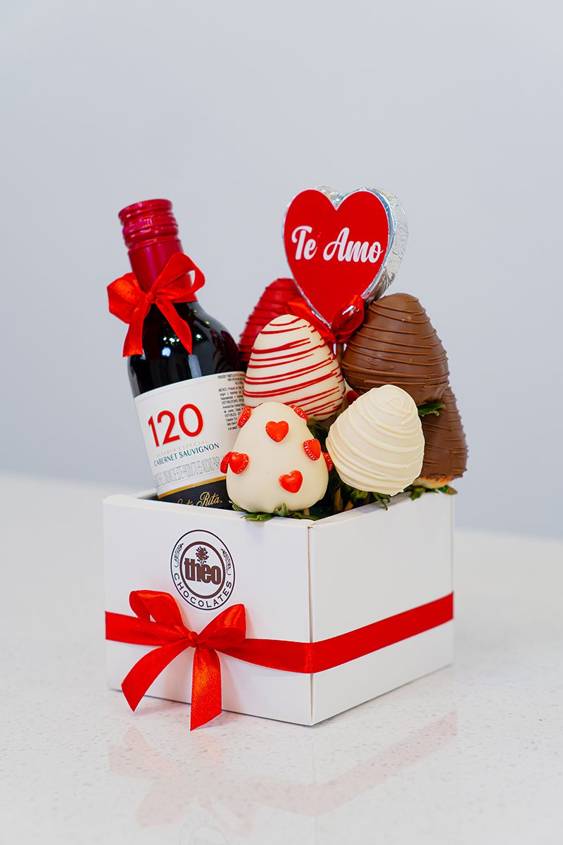 Arreglo con fresas, 1 botellita de vino Riunite 275ml, y 1 paleta de chocolate con mensaje (6 a 8 fresas aprox.)