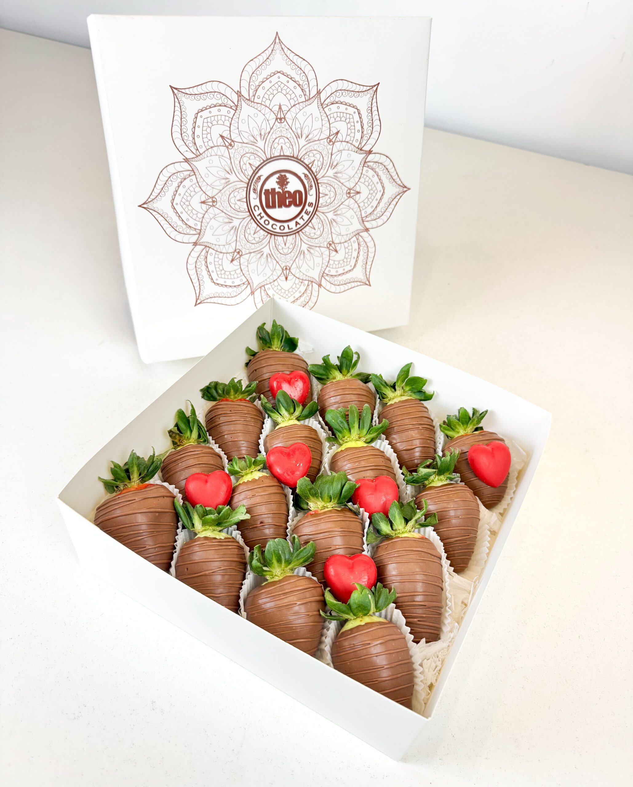 Caja con 16 fresas cubiertas con chocolate y con corazones de chocolate rojo y rosado, decorada con lazo de tela y colilla
