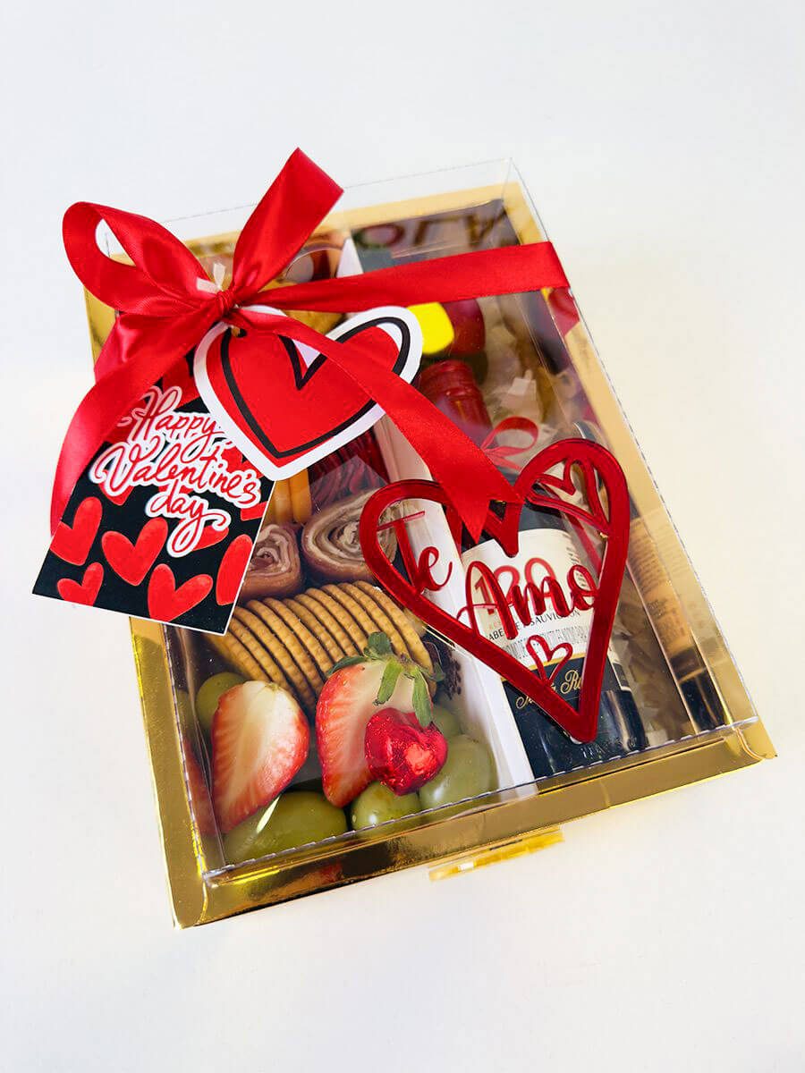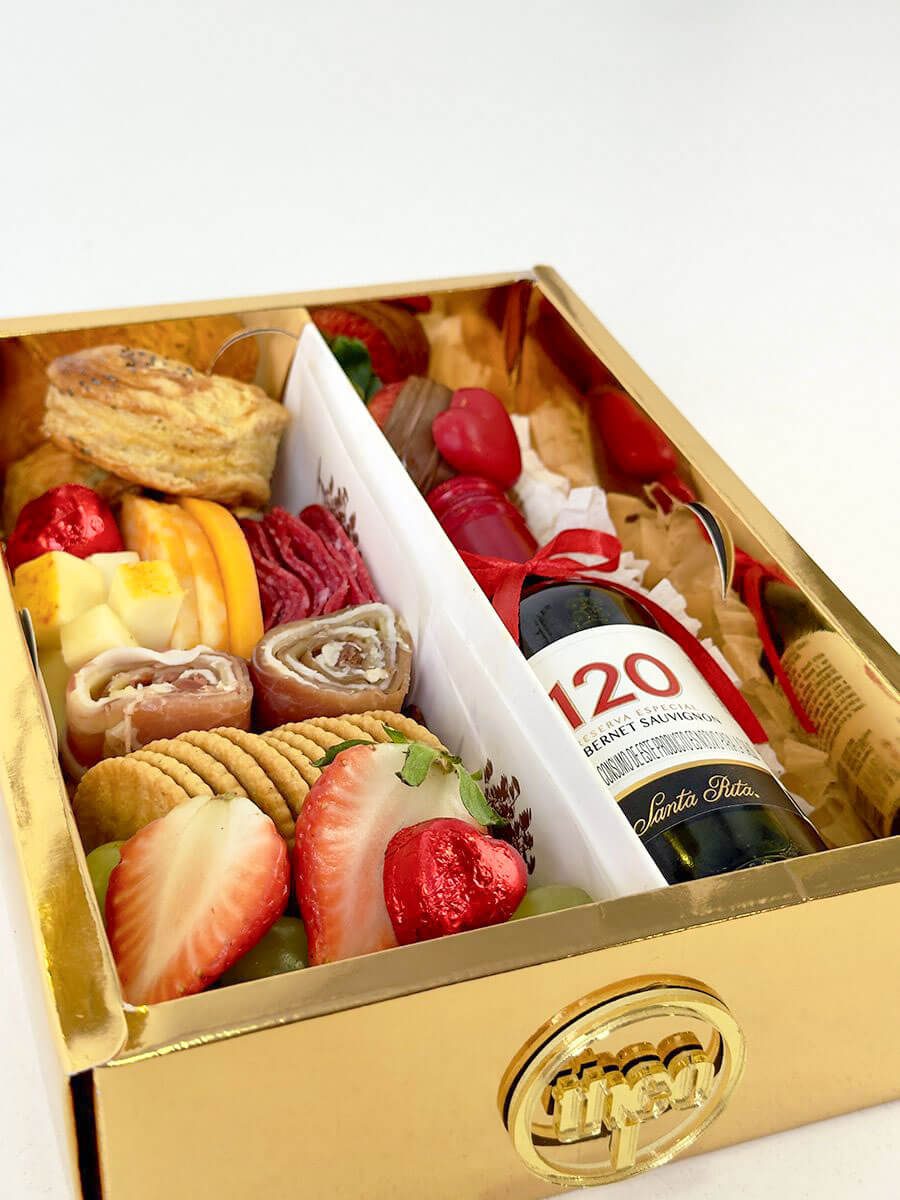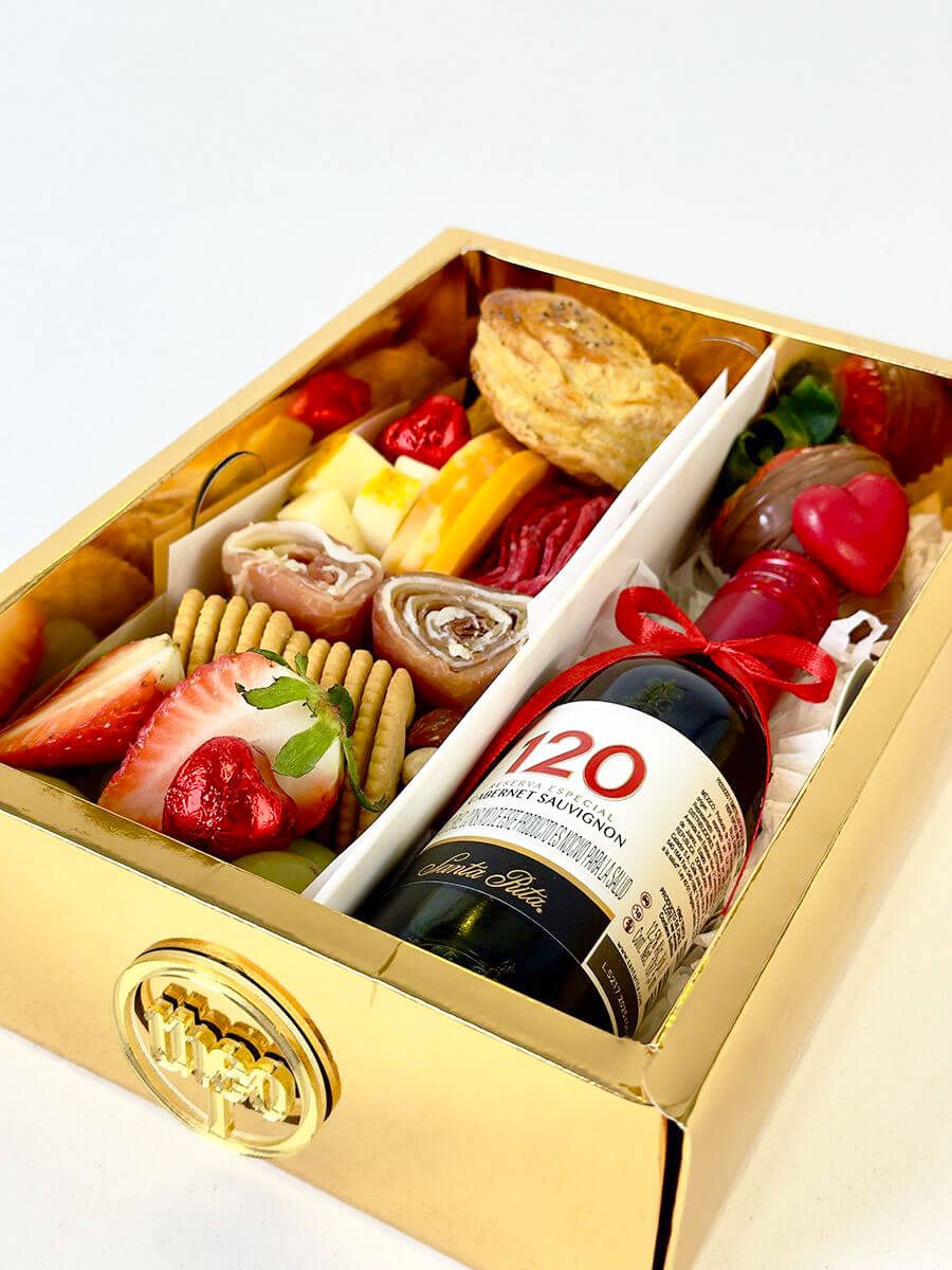 Regala una experiencia de sabores deliciosos, perfecta para los amantes de lo salado con esta caja gourmet que incluye jamones y quesos, uvas, galletitas saladas, mini pastel de pollo, mini enchilada, una fresa cubierta de chocolate y luna mini botella de vino 175ml.