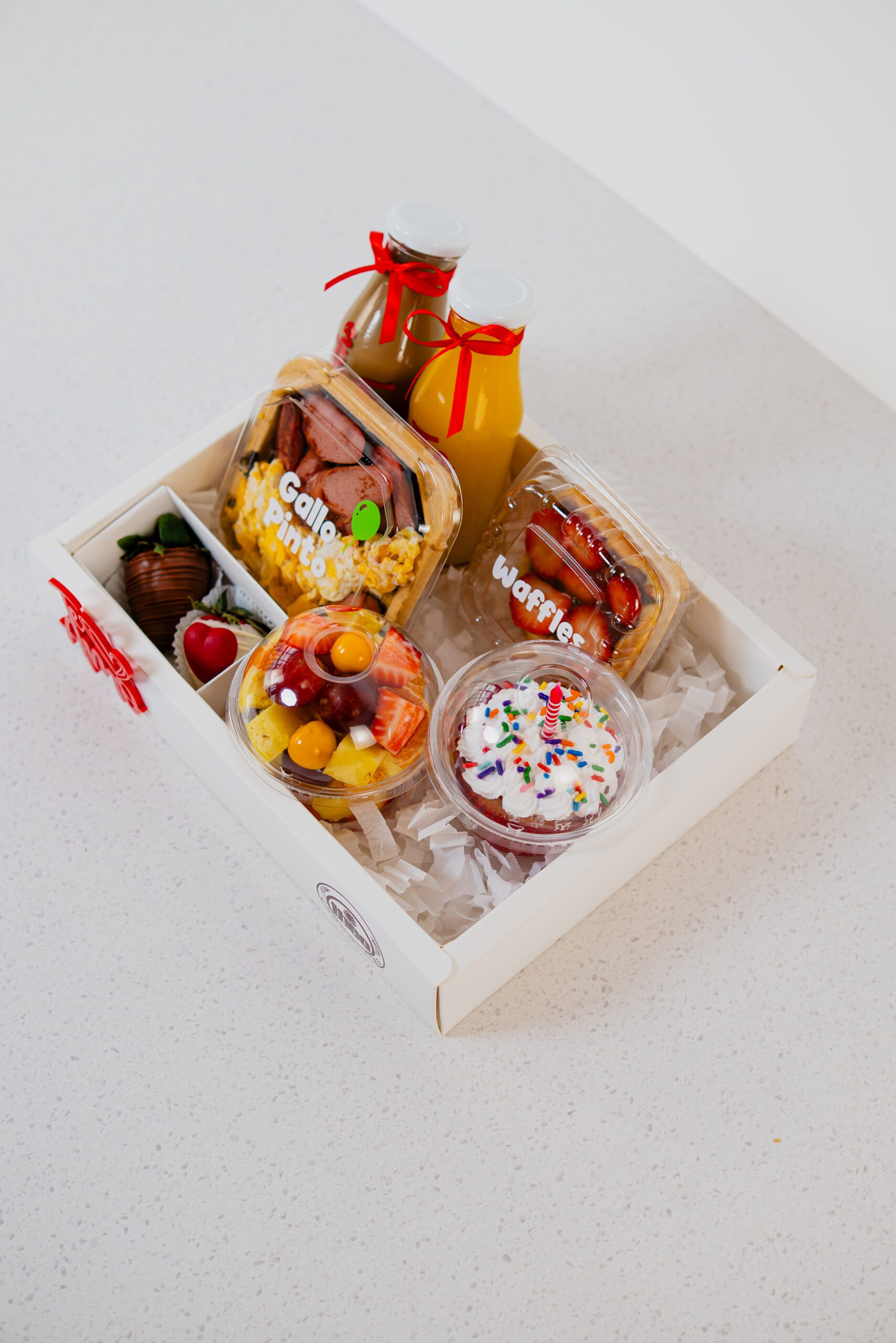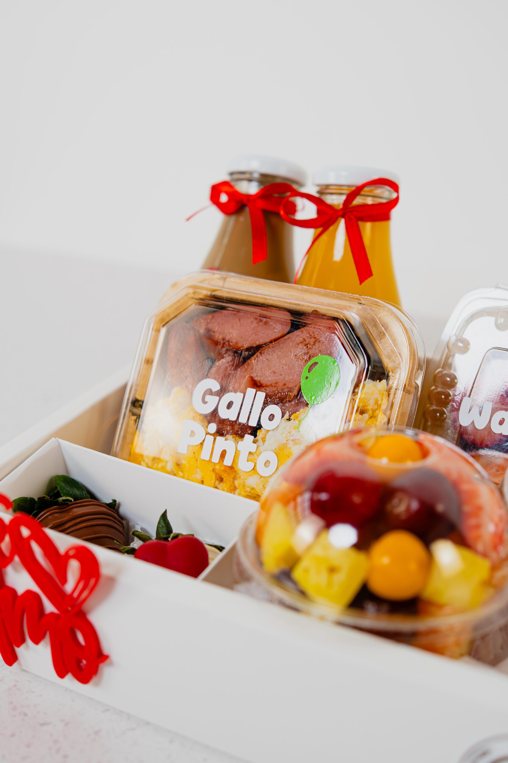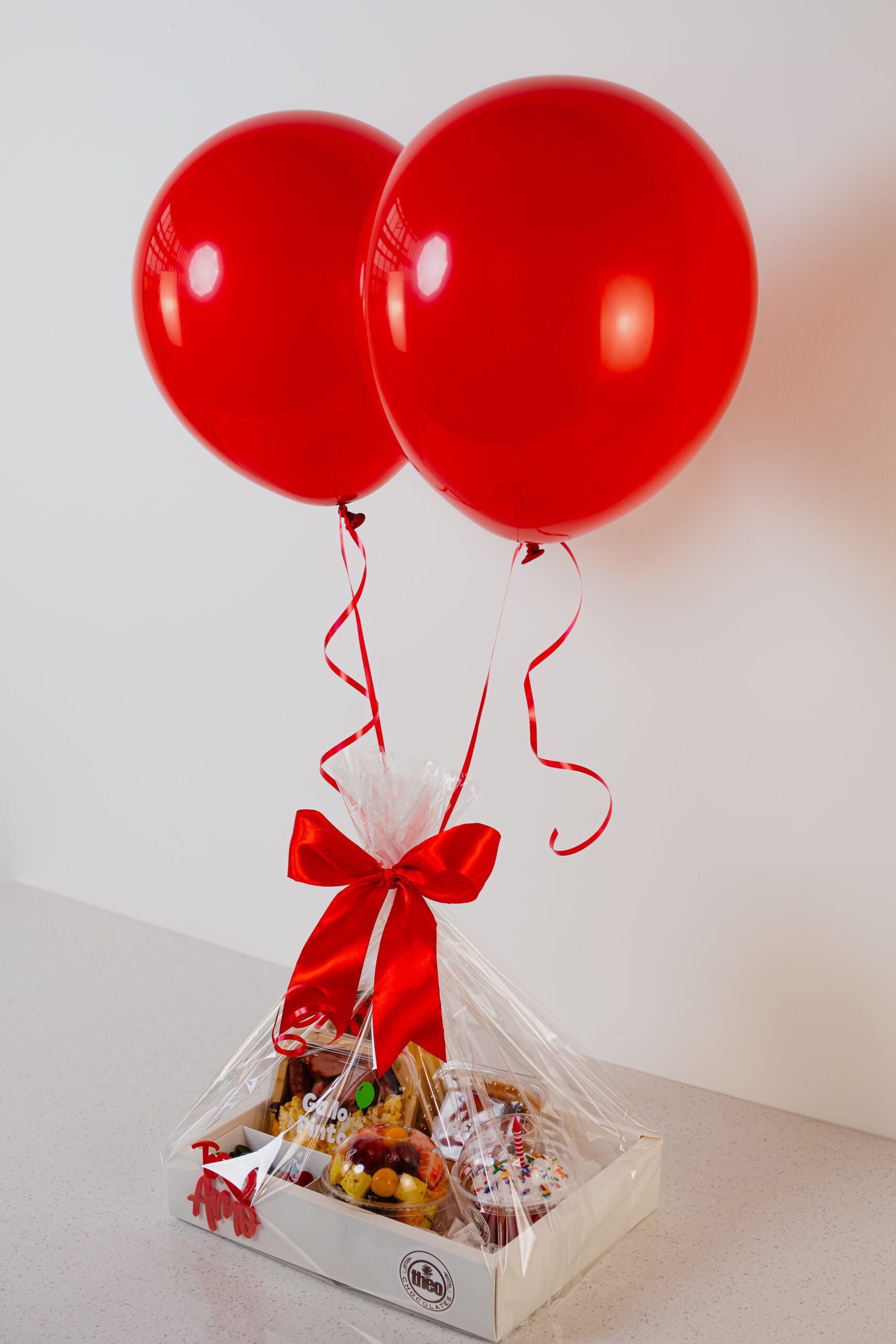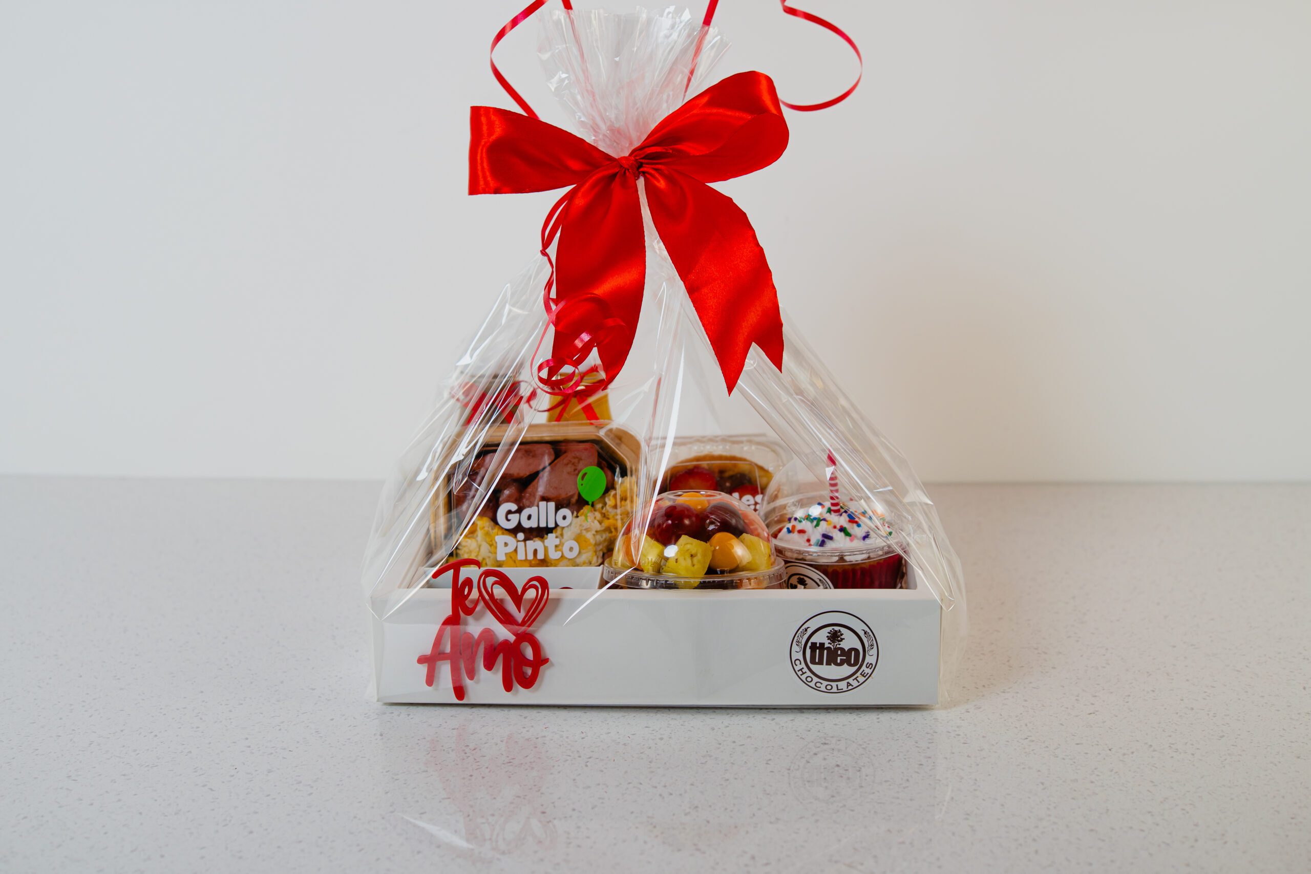 • Caja de cartón blanco rígido decorada con un topper de “Te Amo” y empacado en celofán con lazo y colilla personalizada