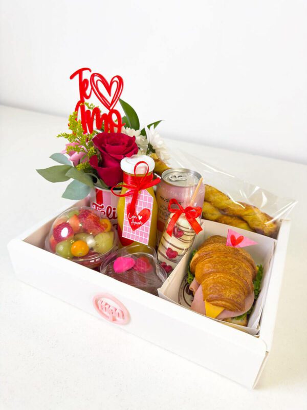 Este delicioso desayuno esta empacado en una caja de cartón blanca rígida, celofán transparente, colillas con diseño de amor, lazo de tela, dos globos de rojos de latex y un globo de diseño inflados con helio