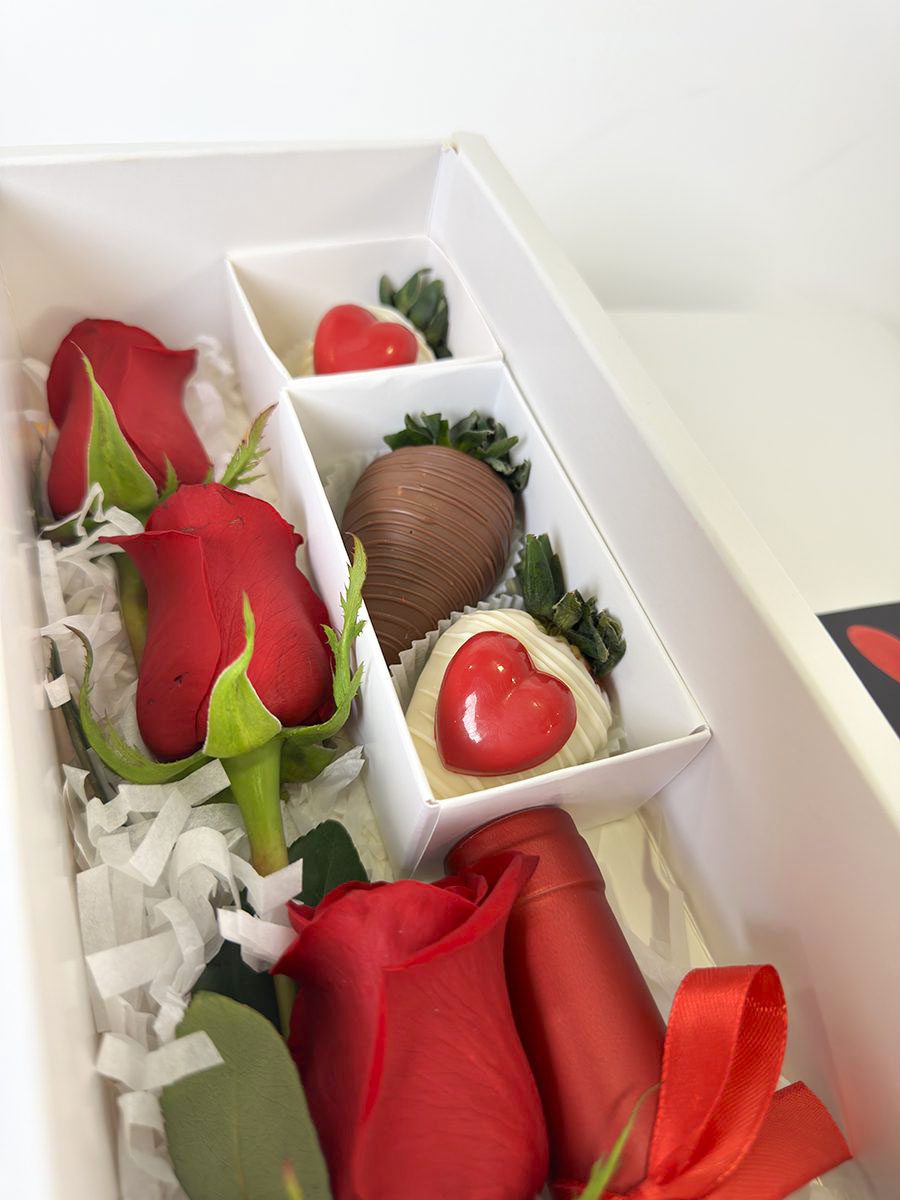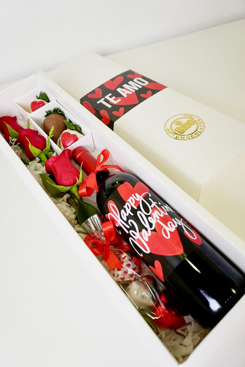 Caja de vino y fresas perfecta para compartir con tu persona especial y tener un día maravilloso. Esta detalle incluye un vino de 750ml con la etiqueta personalizada, tres fresas cubiertas de chocolate con apliques de corazones, tres corazones de chocolate y tres rosas rojo. El empaque de este producto es una caja blanca de cartón rígido decorado con una etiqueta y lazo de tela.