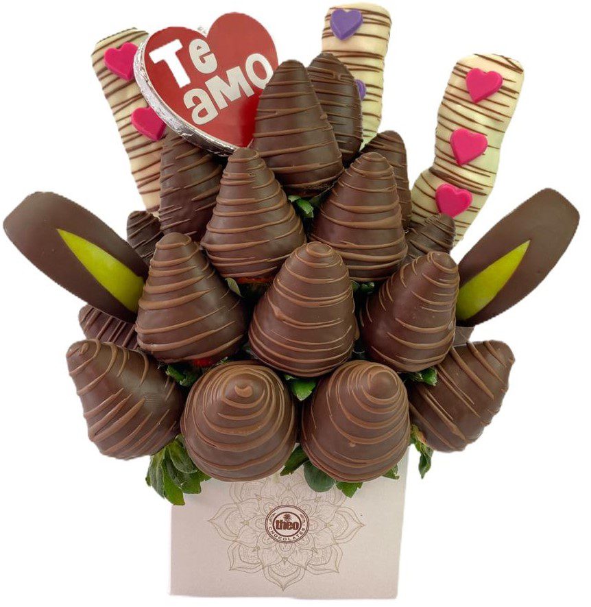 Arreglo con 25 fresas, manzana y marshmallows decorados con corazoncitos, cubierto con chocolate semi amargo y con 1 paleta de chocolate con mensaje cantidad
