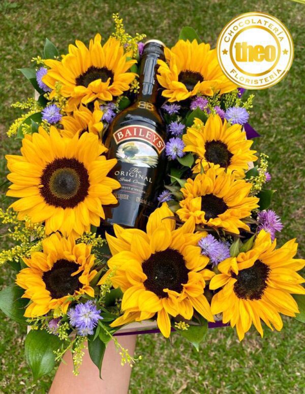 Arreglo con 9 girasoles naturales y una botella de Baileys de 200 ml.