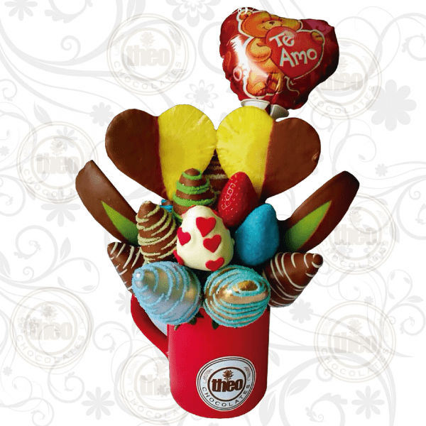 Arreglo frutal taza cerámica 15 fresas corazones de piña y globo pequeño 4″