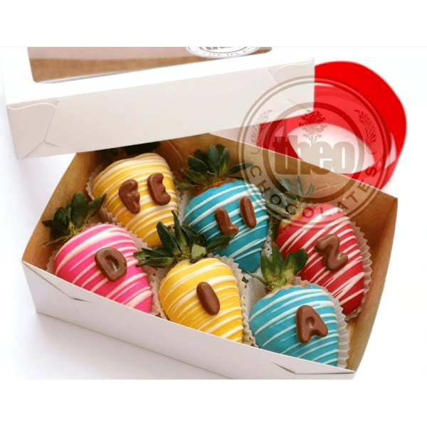 Caja con 6 fresas cubiertas y decoradas con chocolate y letras de “Feliz Día”