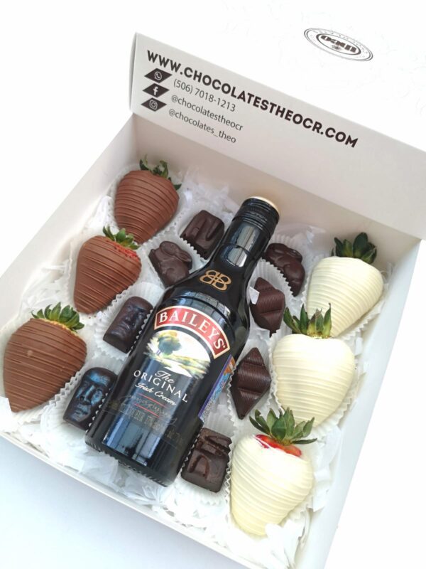 Caja con 6 fresas cubiertas y decoradas con con chocolate, 8 chocolates rellenos de sabores surtidos y una botellita de baileys de 200 ml.