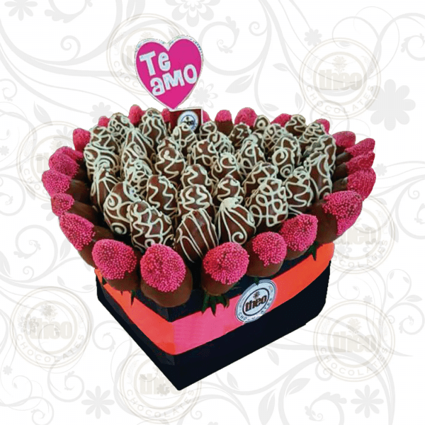 Caja en forma de corazón con más de 45 fresas cubiertas y decoradas con chocolate, con colores para hombre o mujer y una paleta de chocolate con mensaje “Te Amo”