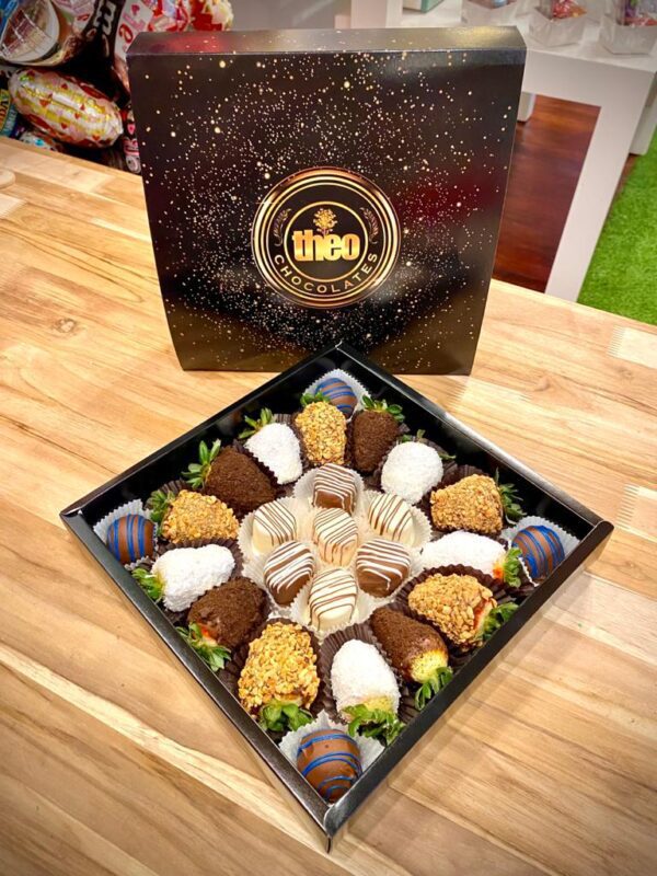 Arreglo con 30 fresas cubiertas y decoradas con chocolate con 6 rosas naturales y 2 globos metálicos de 4” y 1 globo de 9”
