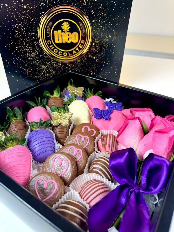 Bombones de baileys y de fresa, 2 corazones de chocolate y arroz tostado, mariposas de chocolate y 4 rosas naturales.