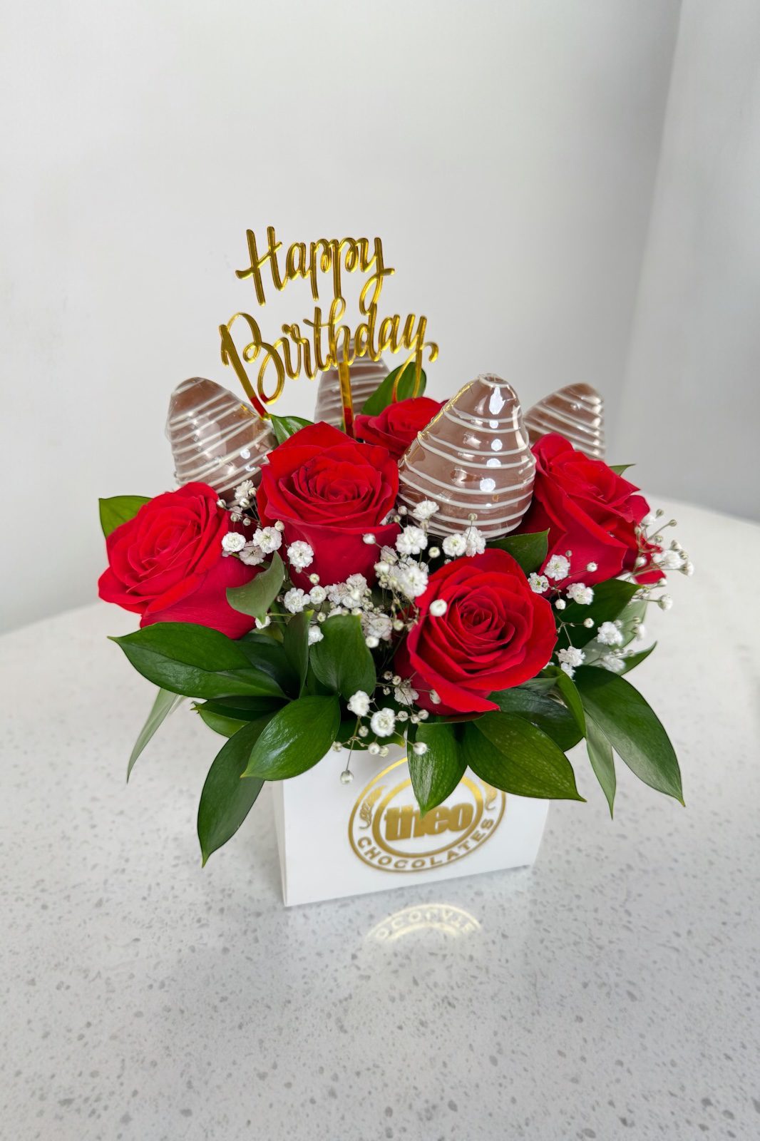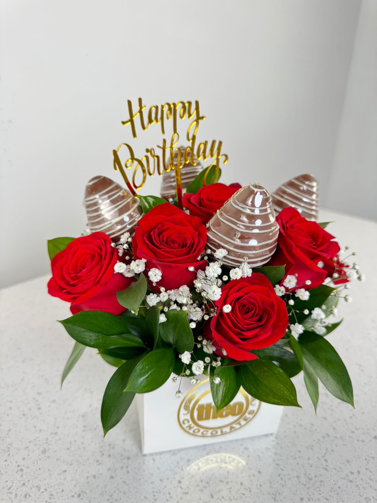 Caja Petit con 9 rosas rojas y 4 fresas cubiertas de chocolate de leche. El arreglo incluye como detalle un topper, puede ser de cumpleaños, feliz día o te amo.