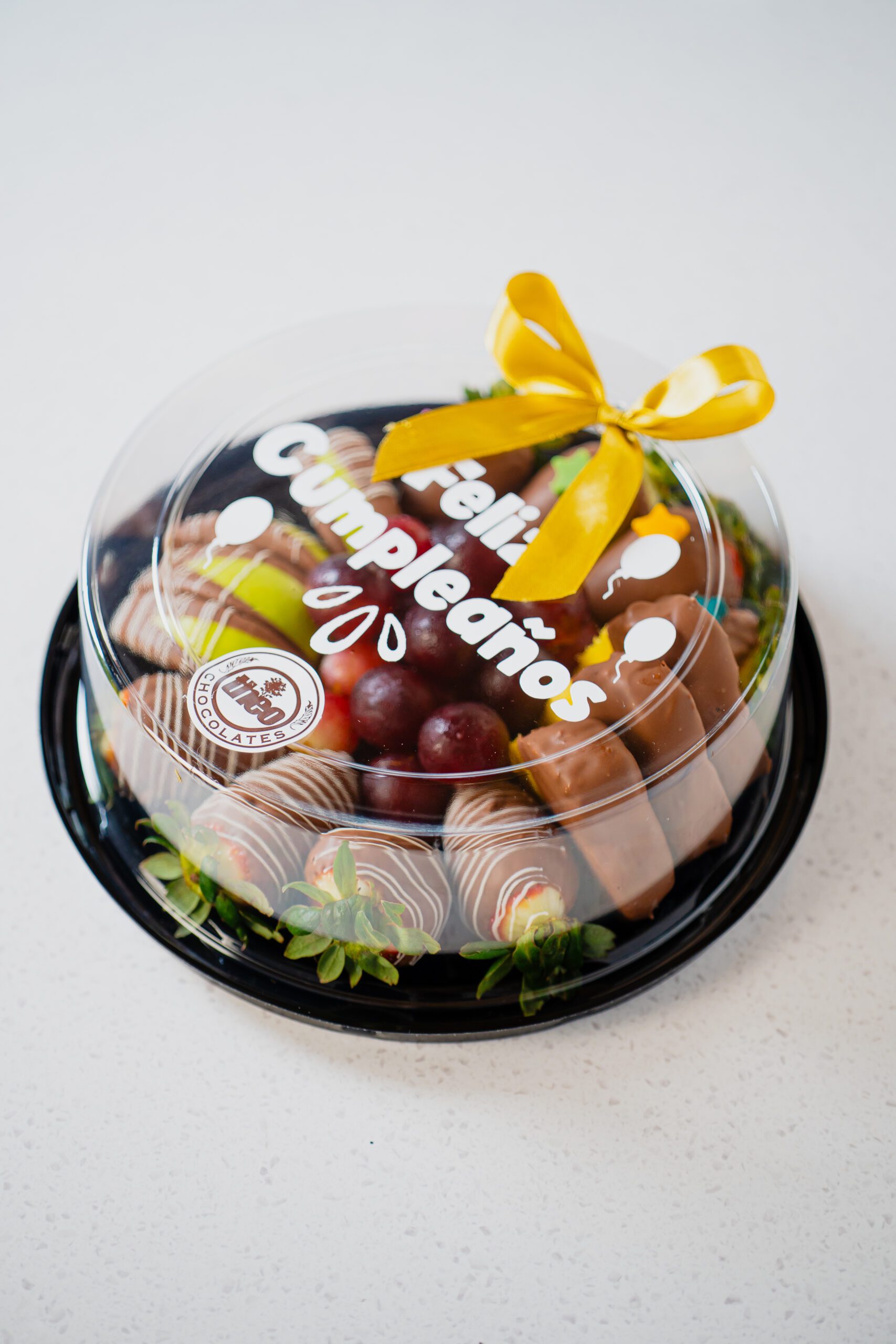 • Plato de frutas con chocolate surtido, contiene fresas, uvas, gajos de manzana y piña. La tapa del plato es personalizable.