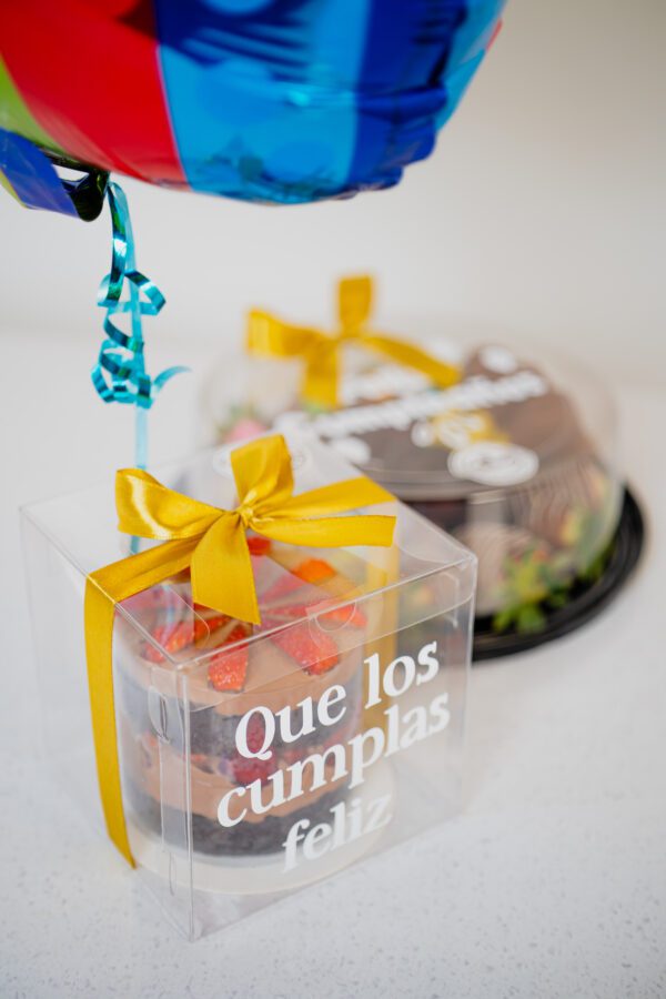 • Queque de chocolate de tamaño personal en caja transparente personalizado.