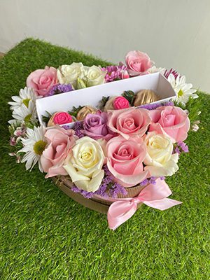 caja en forma de corazón de decorada con un lazo rosa