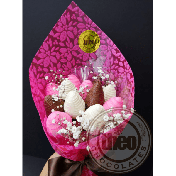 Ramo redondo con 12 fresas cubiertas y decoradas con chocolate y follaje natural