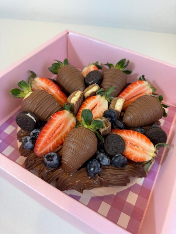 Delicioso waffle con mucha Nutella y fresas cubiertas de chocolate, arándanos, chocolates twix y galletas oreo. Viene en una hermosa caja personalizada!