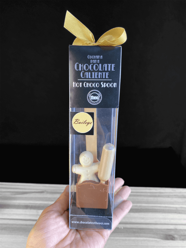 Esta cuchara de 50 gramos de chocolate de leche tiene un aplique de hombrecito de jengibre en chocolate blanco y un shot de Baileys.