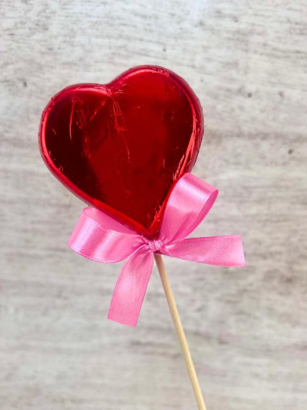 Paleta de chocolate de leche en forma de corazón, envuelta en papel de color rojo.