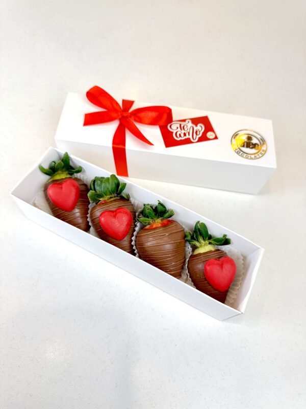 Cajita con 4 fresas cubiertas con chocolate y con dos corazones de chocolate rojo o rosado, decorada con lazo de tela y colilla