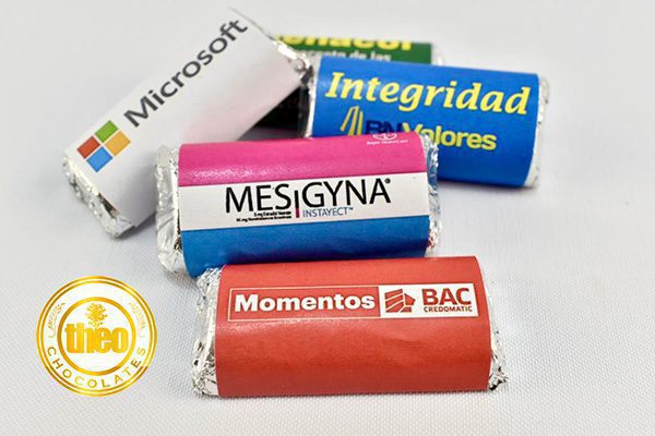Mini barra de chocolate con envoltura personalizada según los requerimientos del cliente ; sus dimensiones son 5,5 c.m. de largo x 2,5 c.m. de ancho y su peso aproximado es de 15gr.