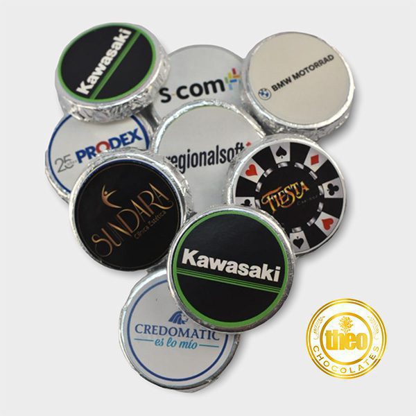 Monedas de chocolate ( 5 cm de diámetro) 12gr. Aprox. con envoltura personalizada y empacada en bolsa celofán transparente para una mejor manipulación.