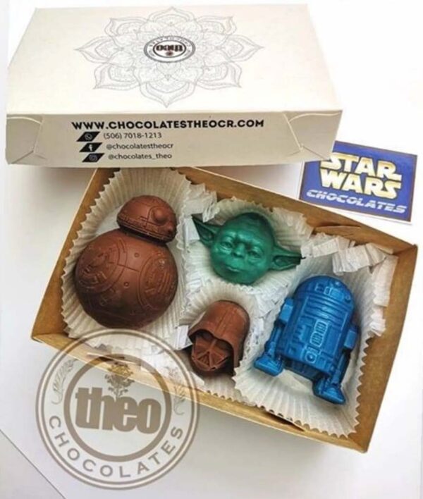 Caja con 4 figuras de chocolate de Star Wars (BB-8, Yoda, Darth Vader, R2-D2)