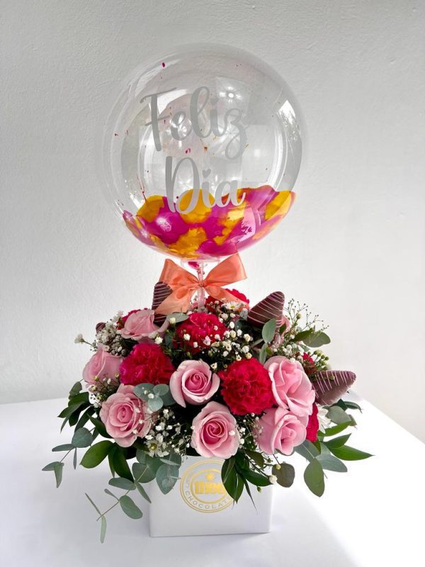 Arreglo con rosas y claveles + globo “Feliz día”