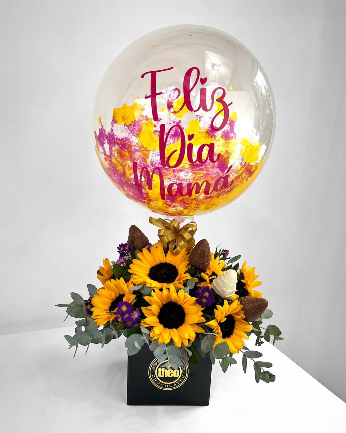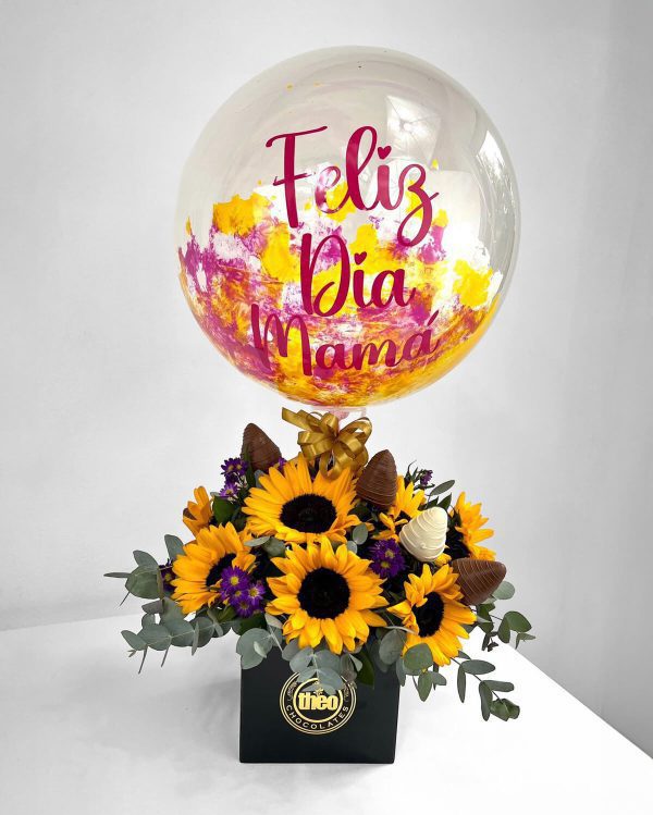 12 girasoles con follaje decorativo, 6 fresas cubiertas con chocolate y un globo burbuja mediano con la frase “Feliz día Mamá”