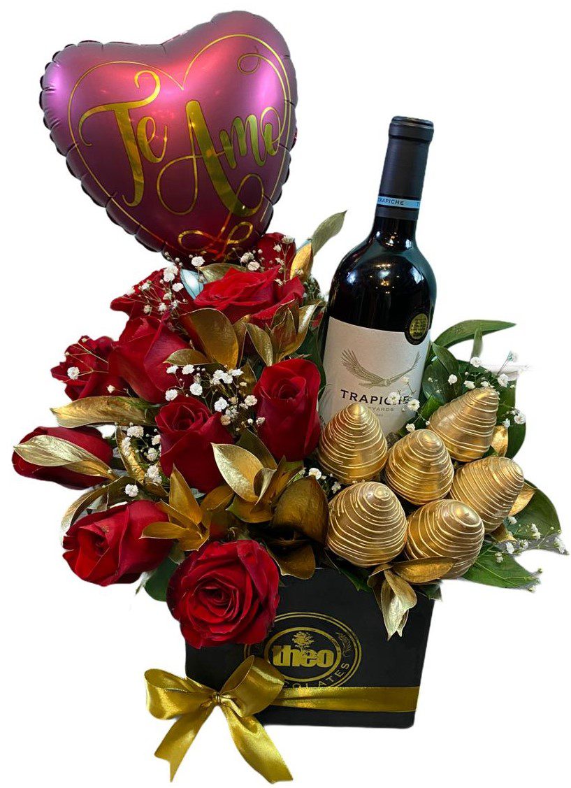 Arreglo con 6 fresas cubiertas y decoradas con chocolate y color comestible dorado, 12 rosas rojas, una botella de 750 ml de Vino Tinto Trapiche y un globo de 9″