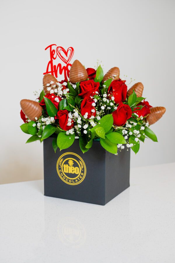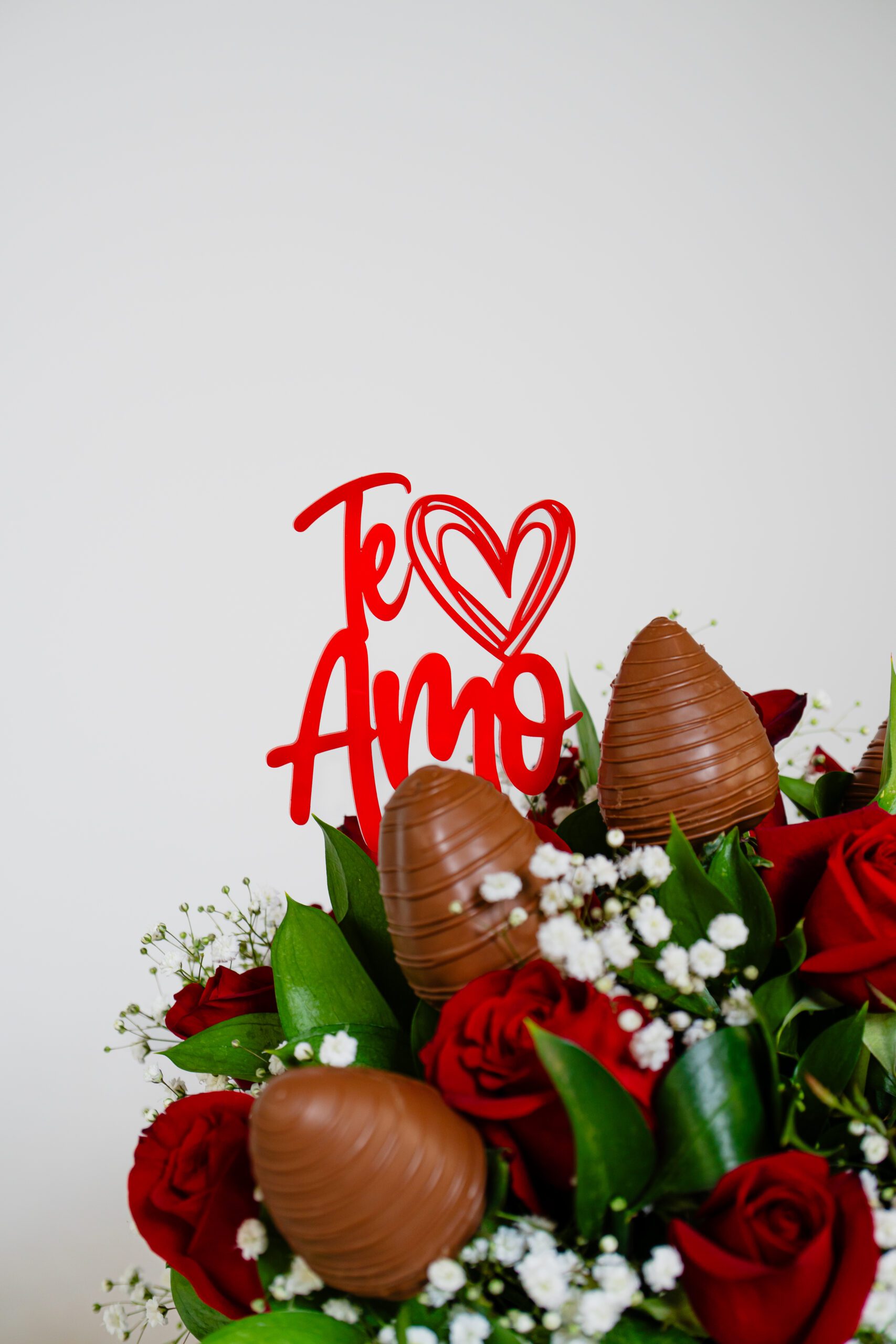 Arreglo con 24 rosas rojas naturales y 6 fresas cubiertas de chocolate. Topper de Te Amo.