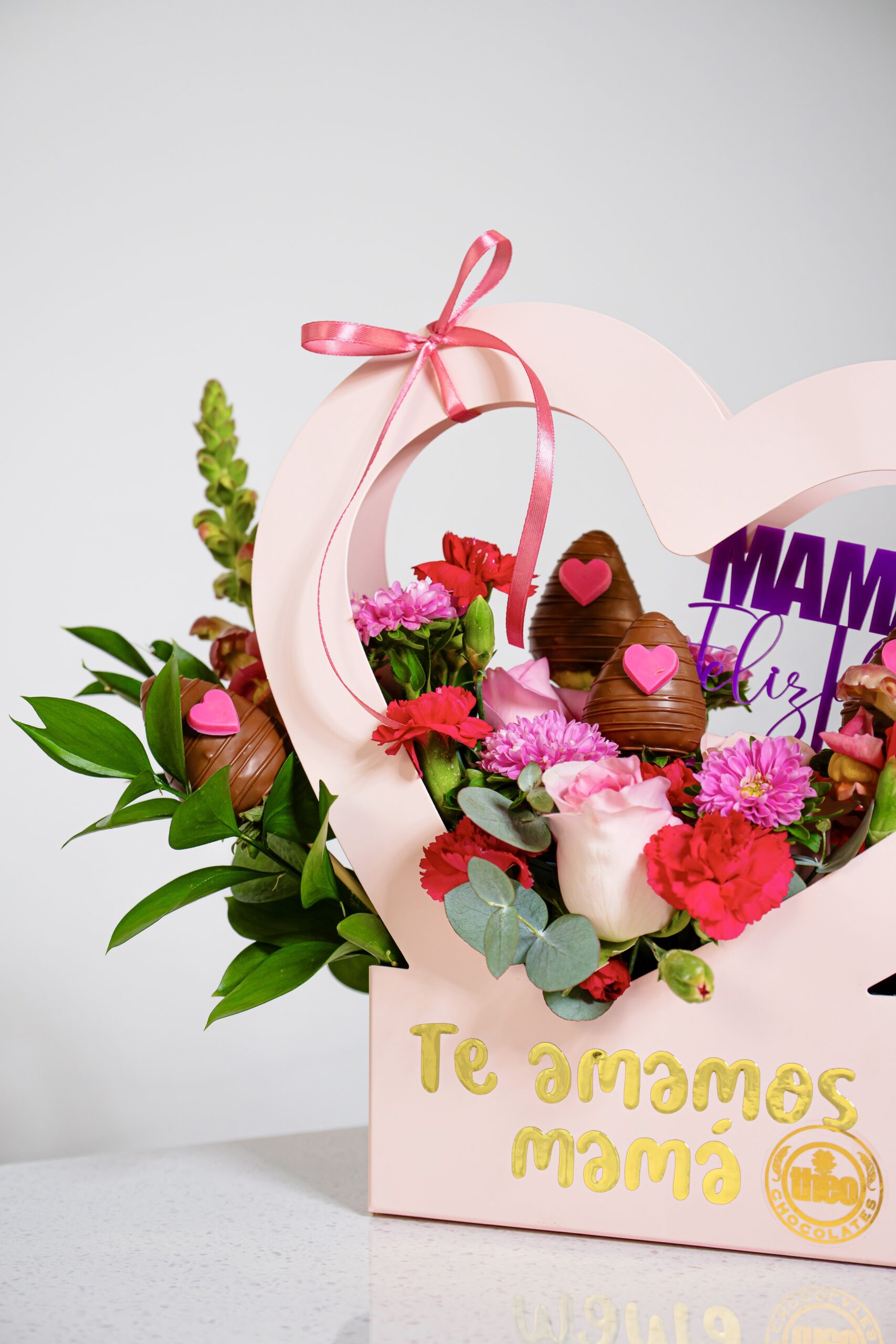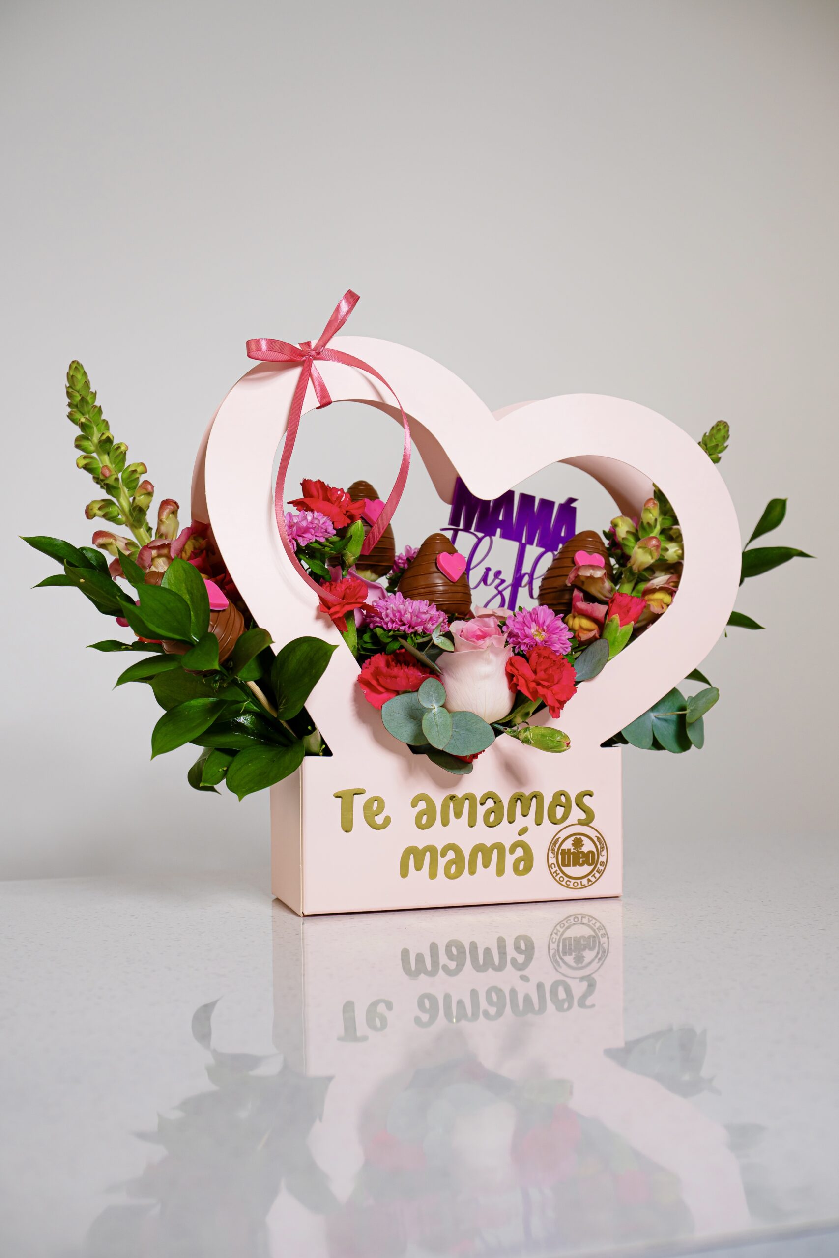 Caja de cartón rosado rígido en forma de corazón, personalizado con la frase “Te amamos mamá”. Topper de “Feliz día mamá”